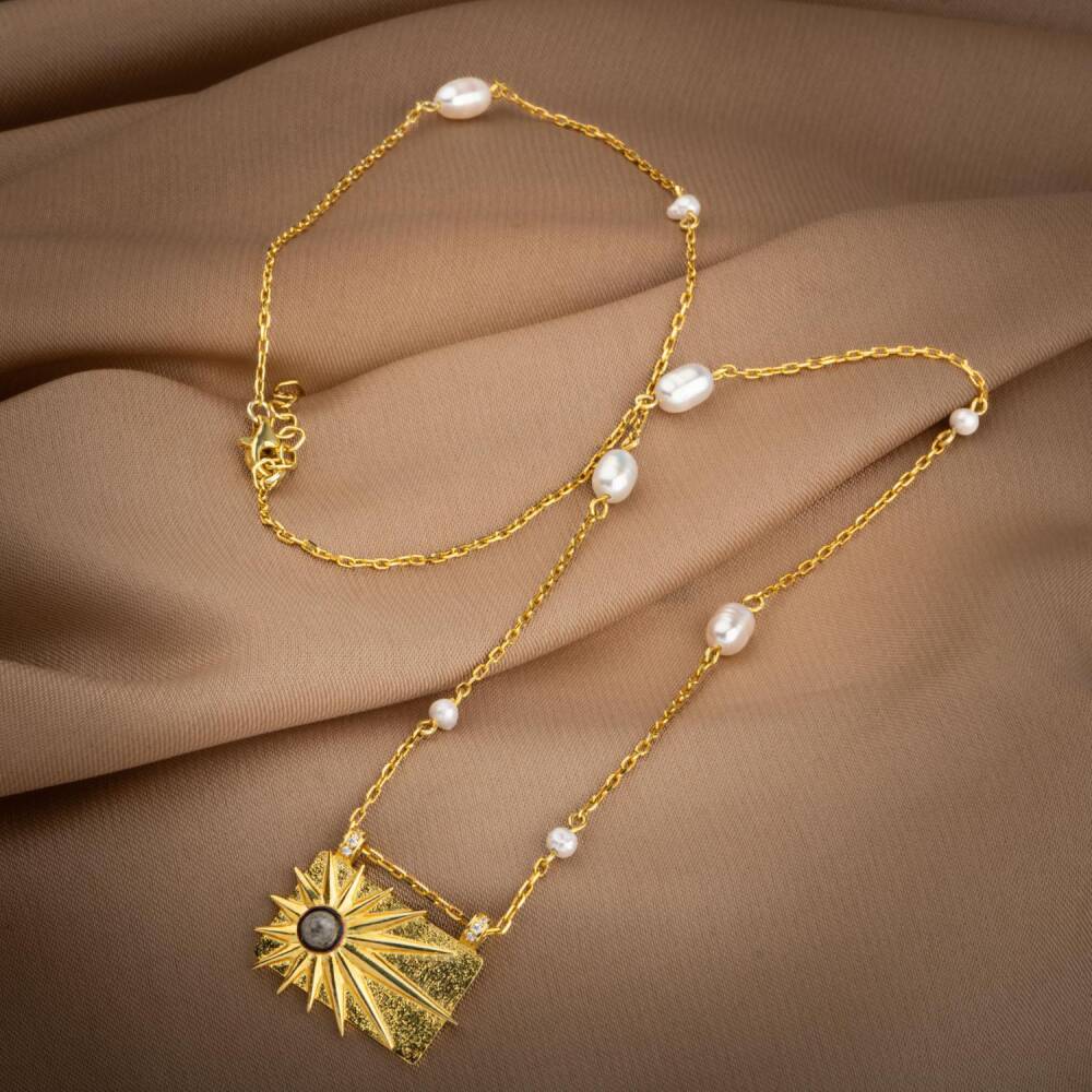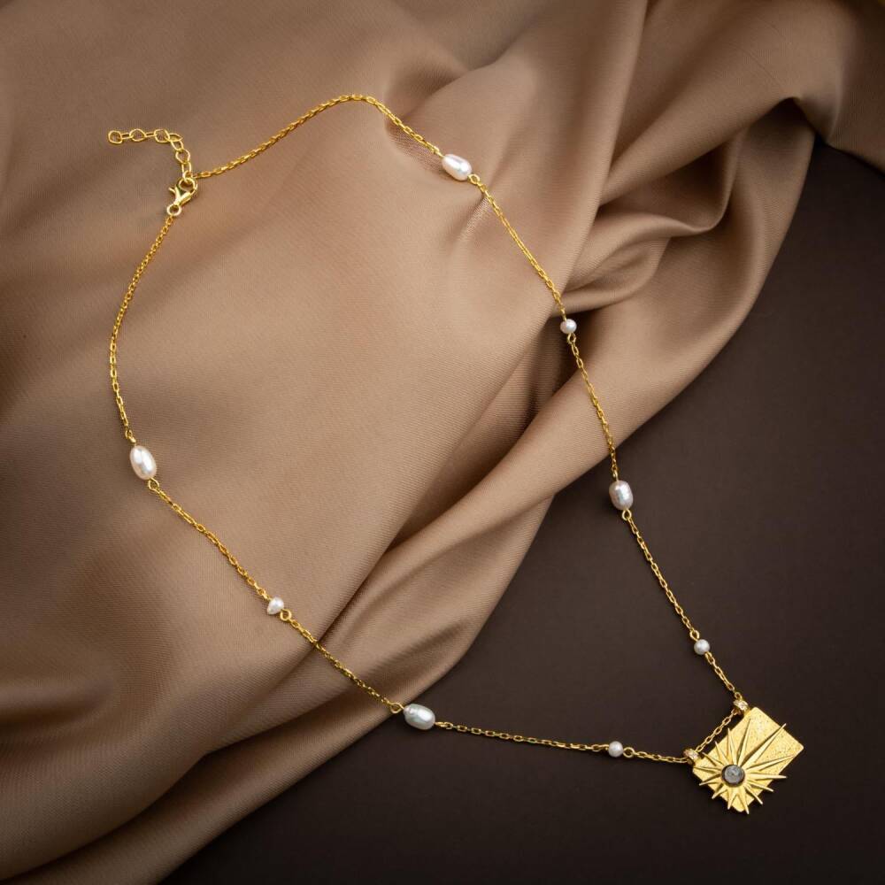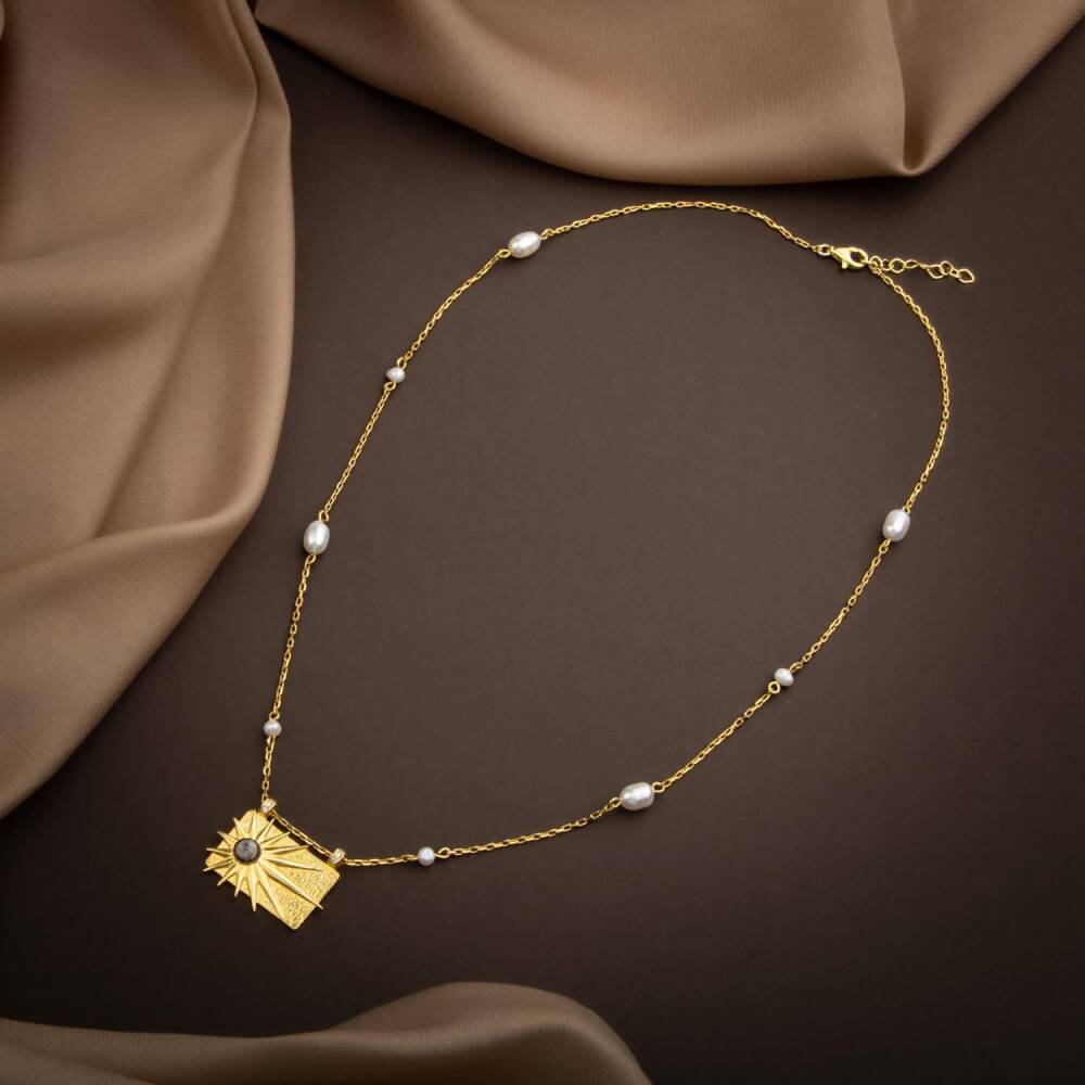 Ay Taşı Taşlı İnci Doğal Taş Gümüş Tasarım Kolye - 54cm