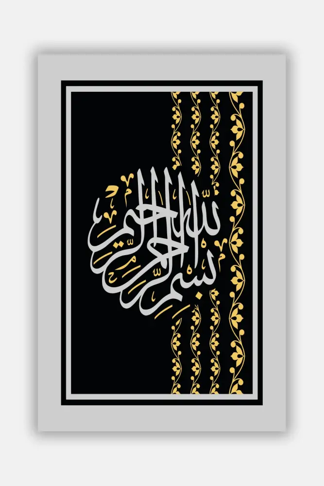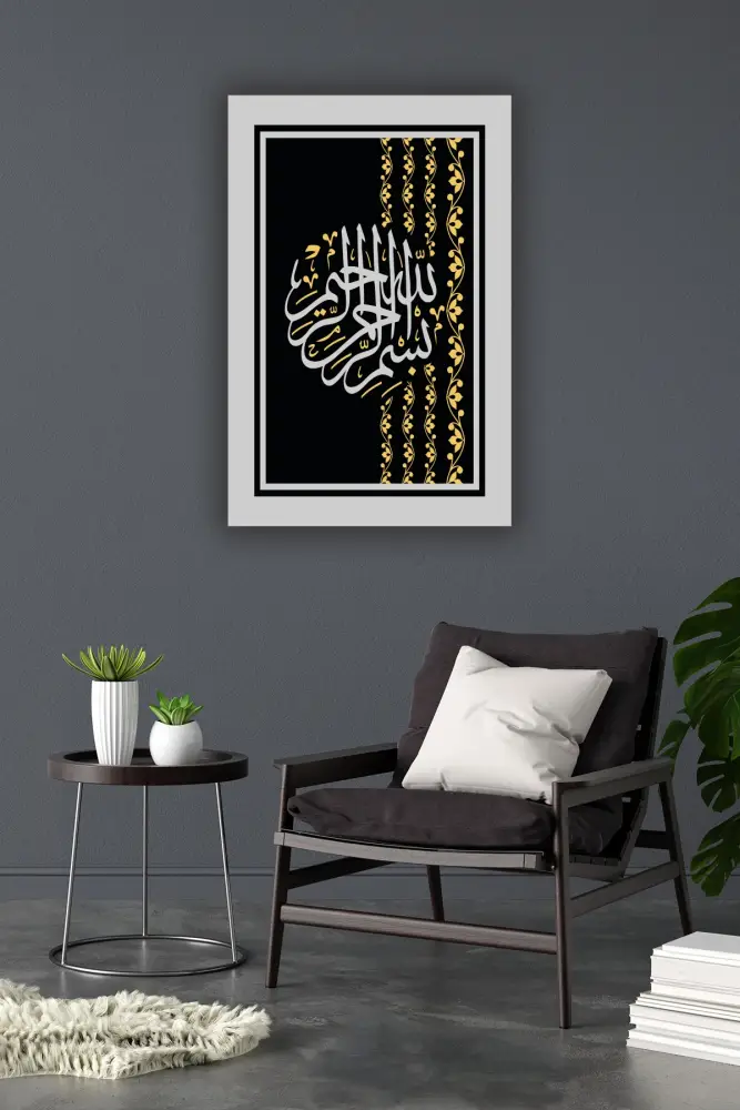 “Besmele Yazılı MDF Tablo”, İslam’ın en güzel ifadelerinden Bismillahirrahmanirrahim yazısını estetik hat sanatıyla duvarlarınıza taşıyor. Siyah zemin üzerine altın ve beyaz detaylarla işlenmiş bu özel tasarım, hem şıklığı hem de huzuru bir arada sunar.
