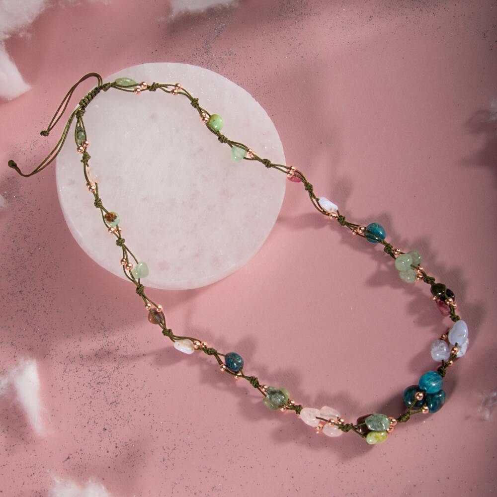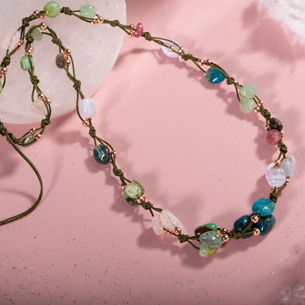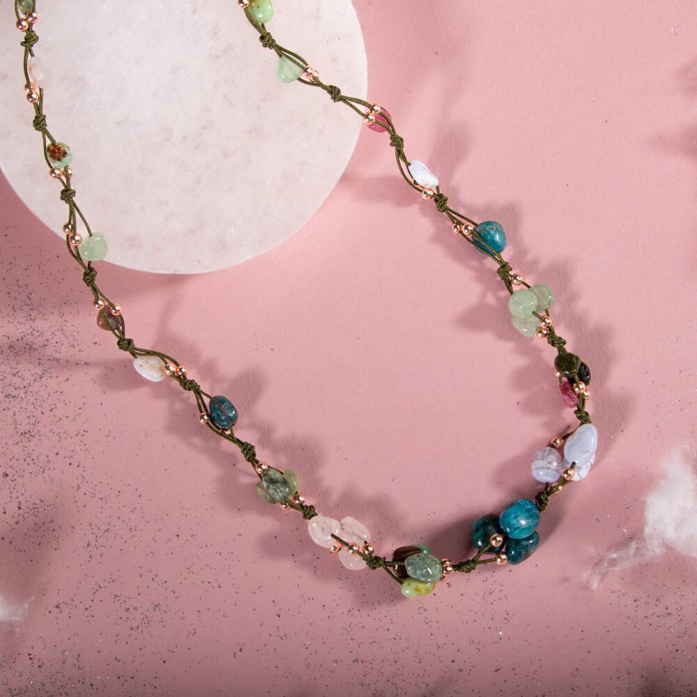 Boğa Burcu Kolye Kalsedon, Kiyanit, Krizopras, Mavi Apatit, Pembe Kuvars, Renkli Turmalin, Yeşil Aventurin