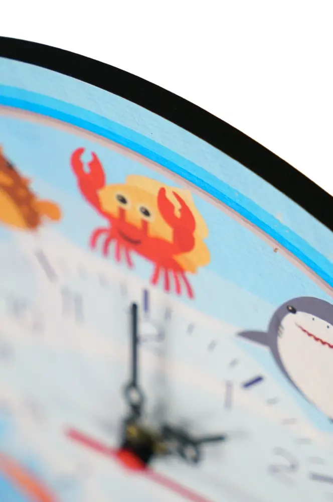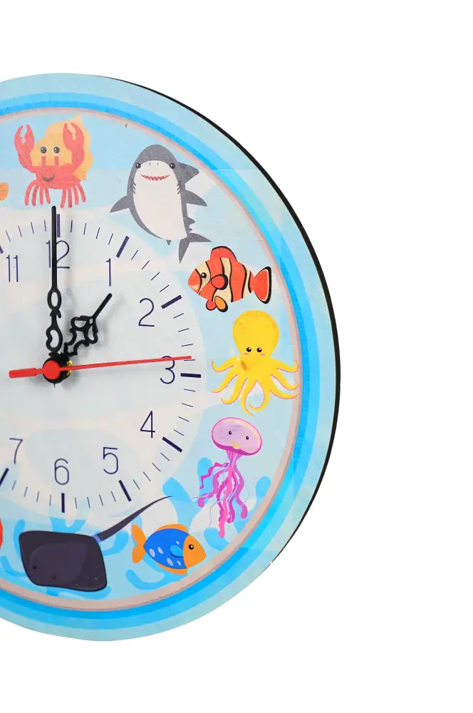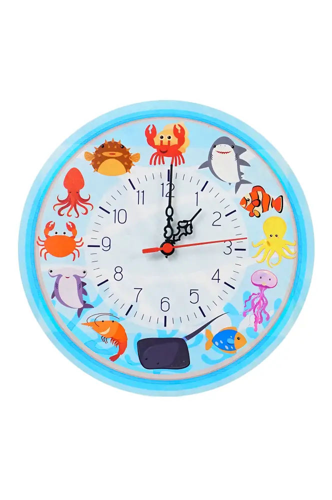 Saatin etrafındaki farklı deniz canlıları, çocukların merak duygusunu besler ve deniz ekosistemini öğrenmelerine katkıda bulunur. Canlı mavi tonlar, odanıza neşe ve ferahlık katar.