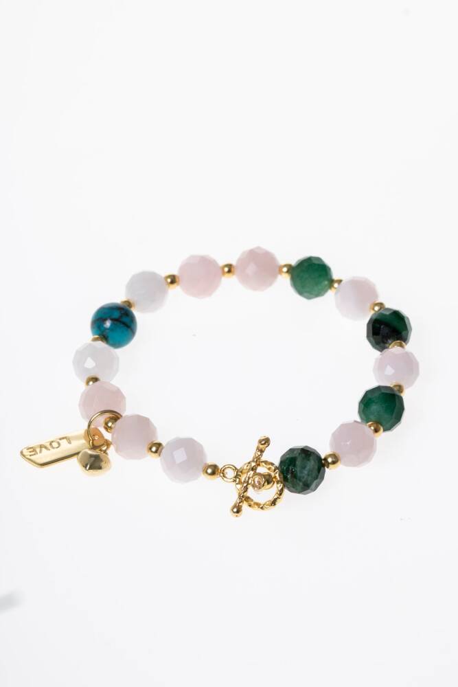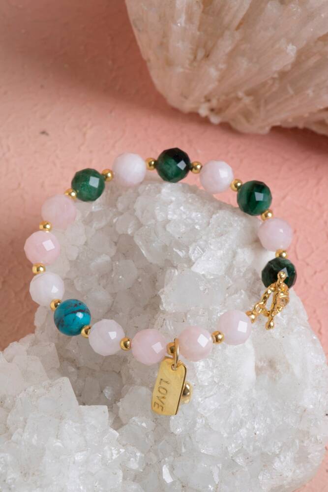 - Zümrüt, Pembe Kuvars ve Firuze gibi doğal taşların birleşimiyle tasarlanmış, göz alıcı bir görünüm sunar. - Gümüş aparatlarla donatılmış bu bileklik, hem şıklığı hem de dayanıklılığı bir arada barındırır. - Genç ve enerjik tarzınıza uyum sağlayacak şekilde tasarlanmıştır; kadın ve kızlar için ideal bir aksesuardır. - Türkiye menşeli olup, yerel üretimle kaliteyi ve özgünlüğü temsil eder. - Bakımının kolay olması için nemli bir bezle silinmesi yeterlidir; böylece uzun süreli kullanım için idealdir.