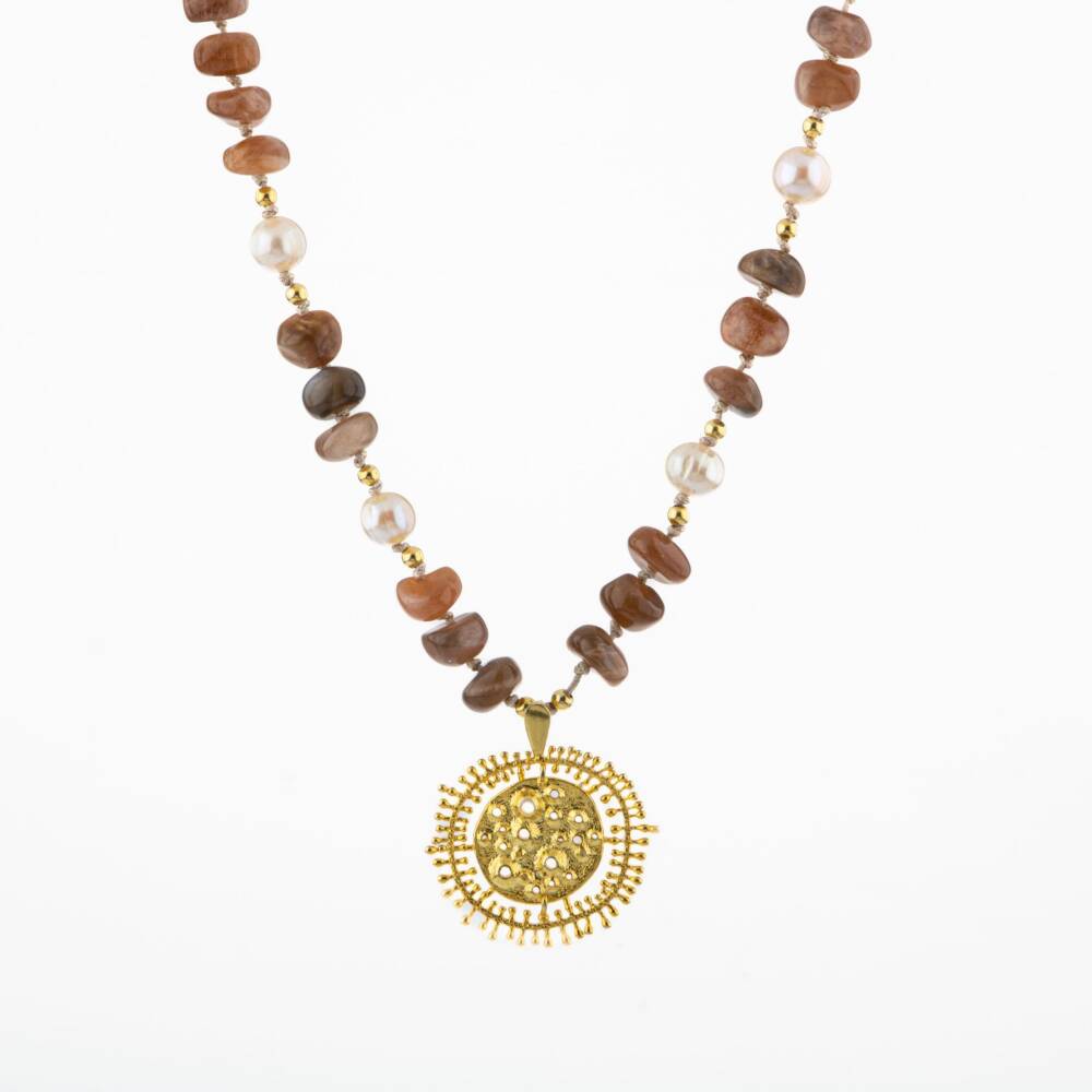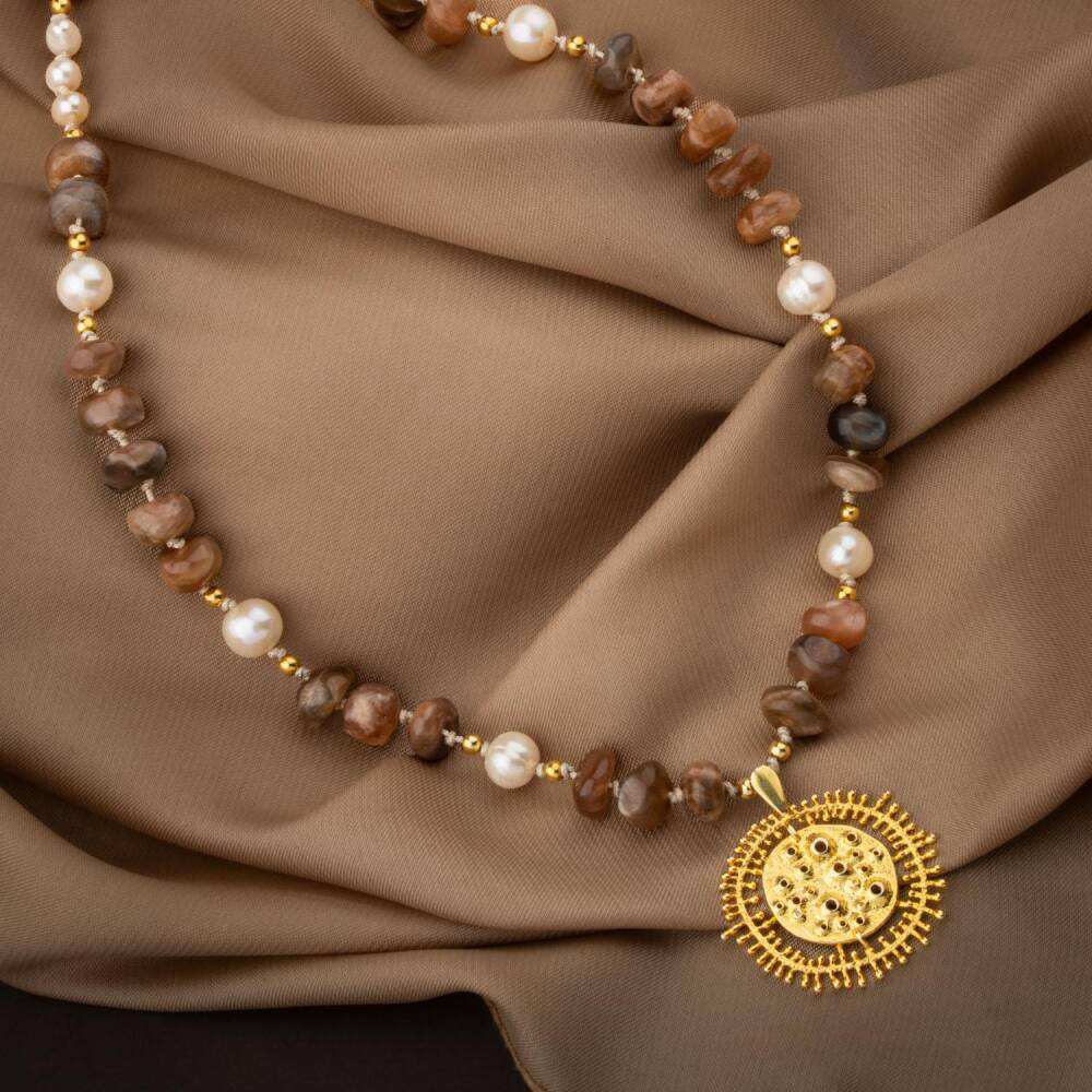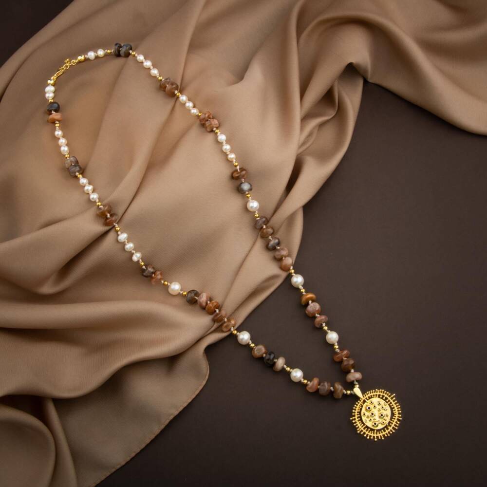 Güneş Taşı-İnci Doğal Taş Gümüş Tasarım Kolye - 60cm