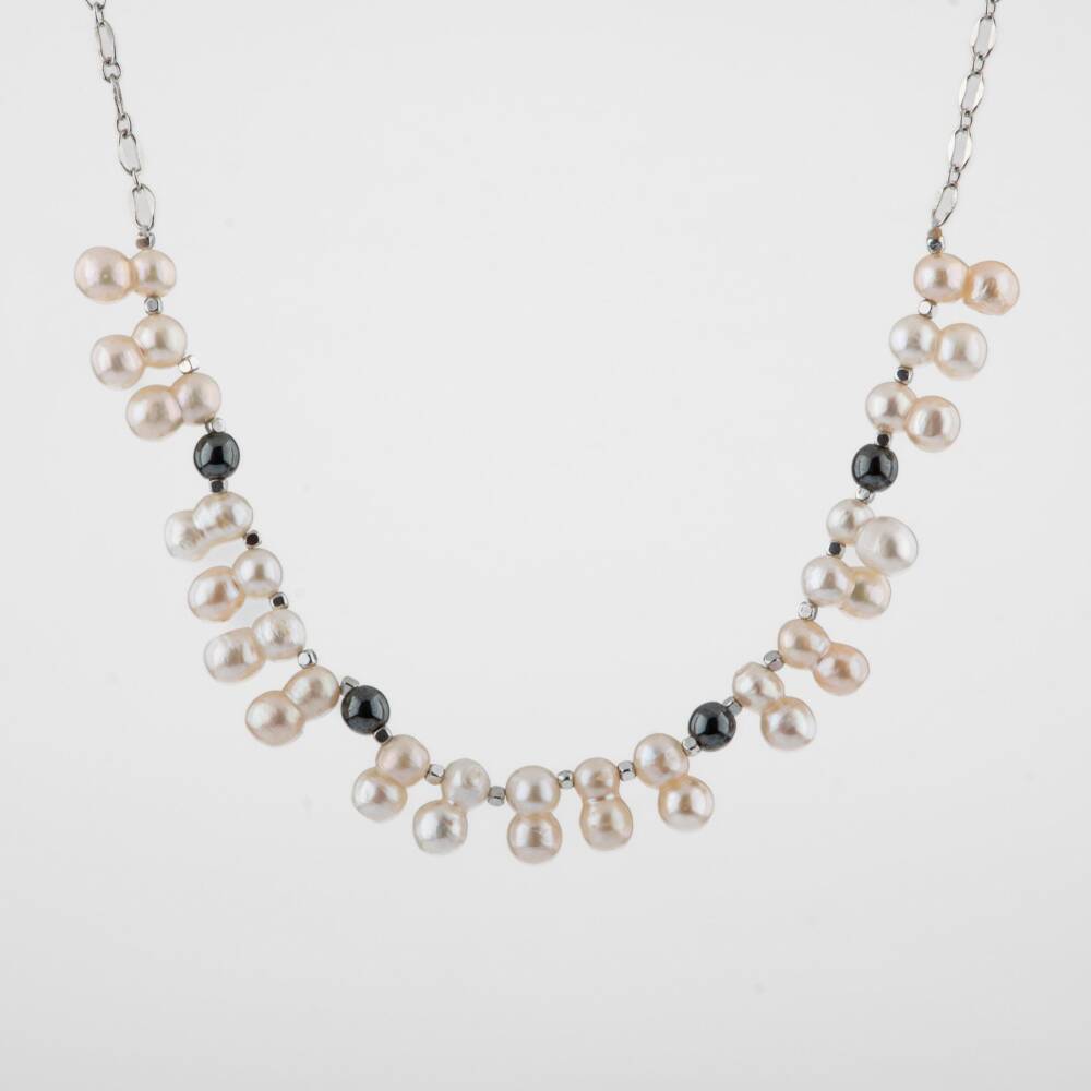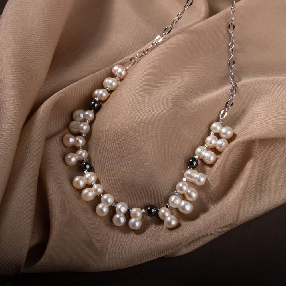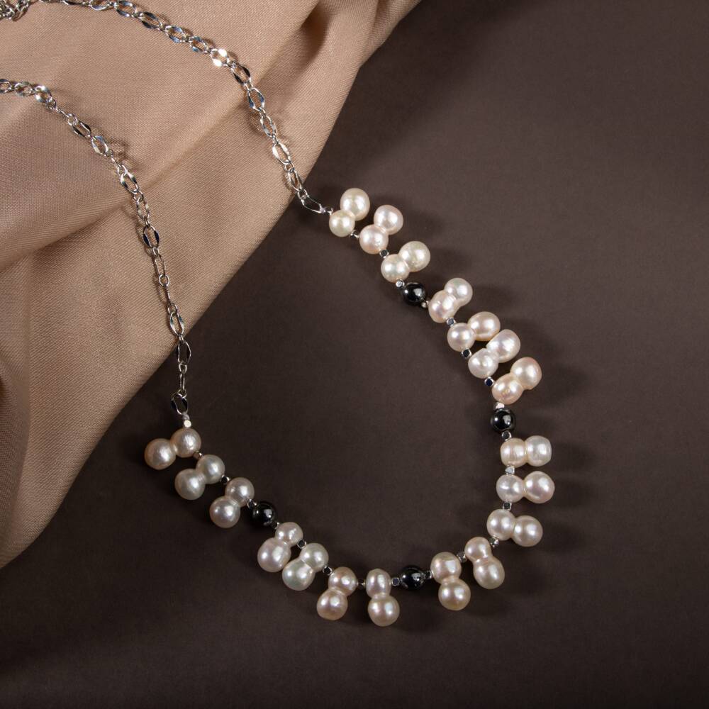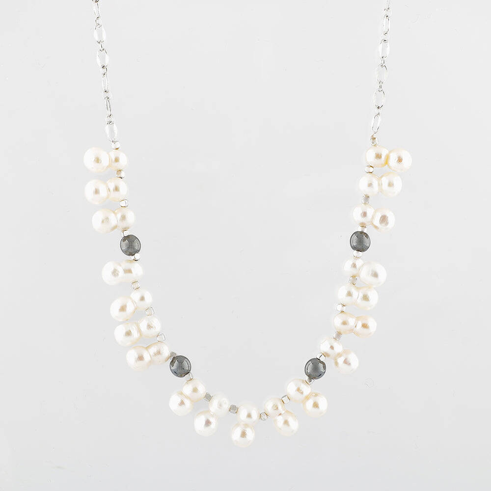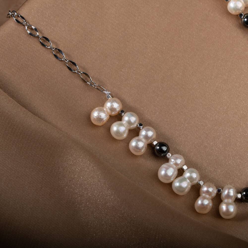 İkili Taş İnci-Hematit Doğal Taş Zincir Gümüş Kapama Kolye