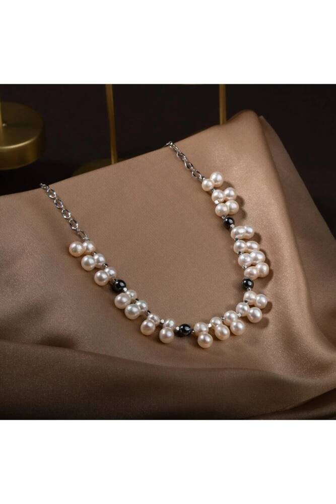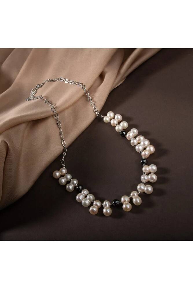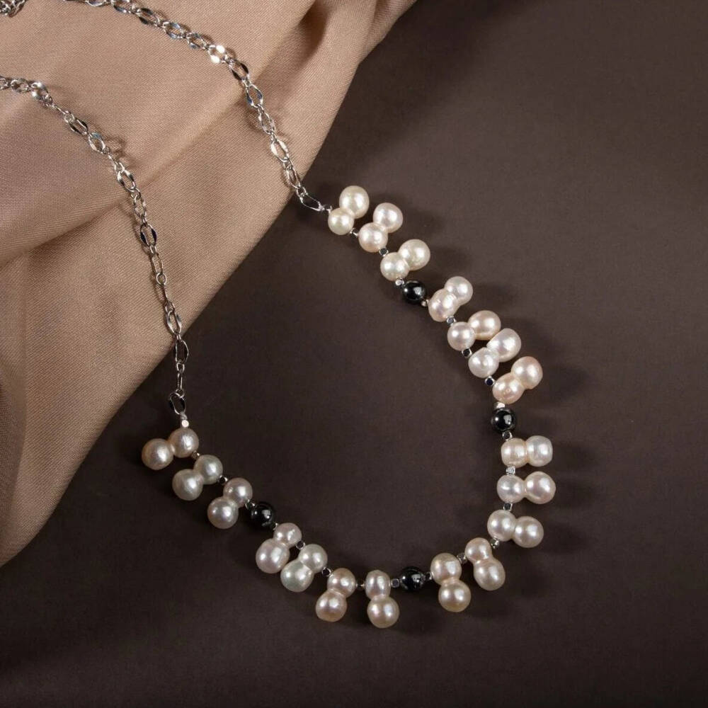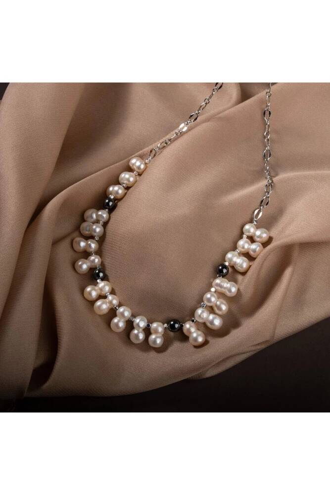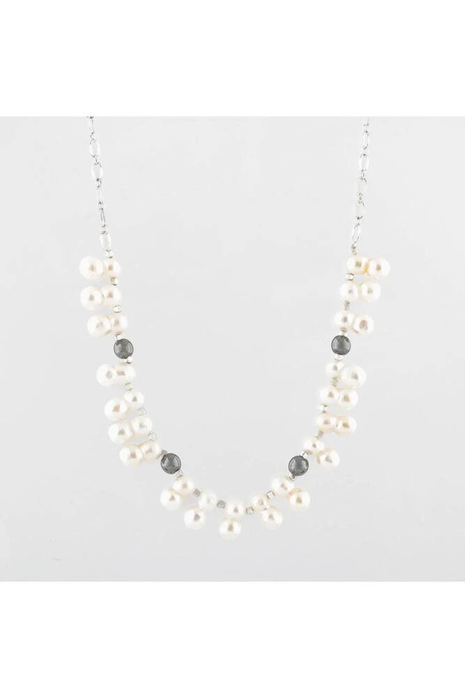 İkili Taş İnci-Hematit Doğal Taş Zincir Gümüş Kapama Kolye