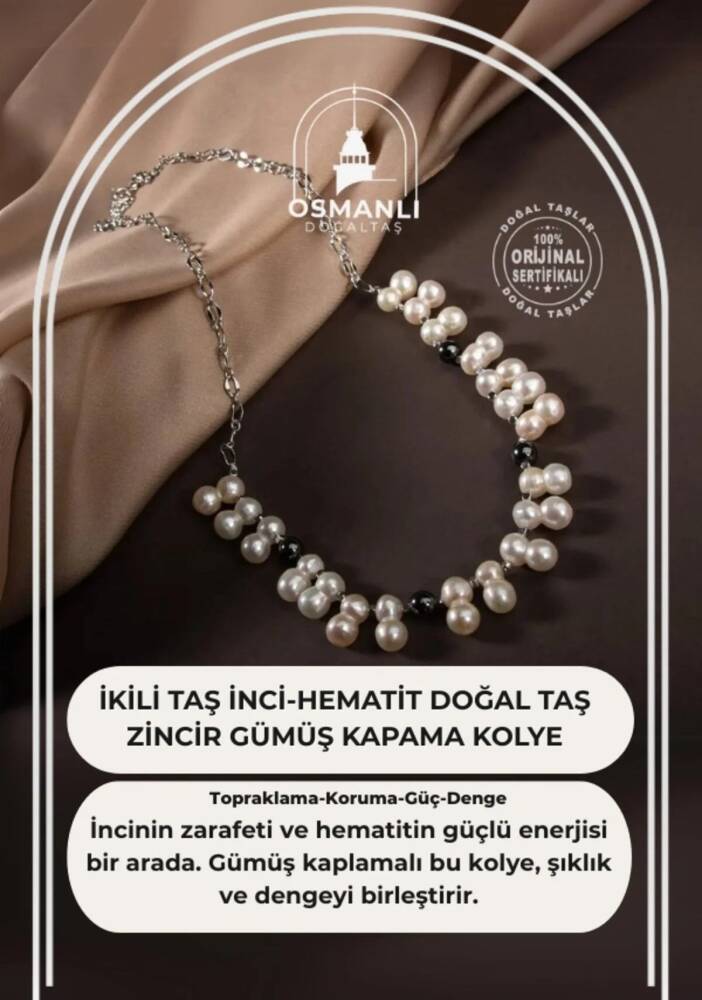 TÜM TAŞLARIMIZ SERTİFİKALI ve %100 ORJİNAL GERÇEK DOĞAL TAŞTIR.  Doğal taş takılarının bu eşsiz güzelliği ve faydalarıyla müşterilerimize en kaliteli ve en özel takıları sunuyoruz. Her bir takı, tasarımcılarımız tarafından özenle hazırlanmış, doğal taşların renkleri ve enerjileri ile birlikte, size en uygun olanı seçmenizi sağlar. Doğal taş takılarımız, herhangi bir moda stiline mükemmel bir şekilde uyum sağlar. Aynı zamanda doğanın eşsiz güzelliklerini keşfetmek isteyenler için de harika bir seçenek sunarlar. Kendinizi özel hissetmek istediğinizde, doğal taş takılarımız sizin için mükemmel bir seçenek olacaktır. Ürün İçeriğindeki Taşlar Aşağıda Listelenmiştir.    Hematit Taşı Özellikleri: Hayatta kalma iç güdüsünü artırır. Cesaret, irade ve özgüven duygularını artırır. Cesaret, irade ve özgüven duygularını yükseltir.   İnci Özellikleri: Dişil enerji verir. Hem ruhsal hem de bedenen hafiflik verir. Kaygıyı, gerginliği ve kötü düşünceleri engeller.       BİLGİ: Doğal taşların faydaları günümüzde birçok kullanıcıdan alınan geri dönüşlerde defeatle gözlemlenmiştir. Kan dolaşımına ve sindirim sistemine bir ilaç gibi dahil edilememesi; enerjileri ve kullanımı açısından sunacağı faydaya inanma ön koşulu gerektirmesiyle kesinlikle bir ilaç mahiyetinde değildir. Fakat geçmişten günümüze Biruni ve İbn-i Sina gibi büyük tıp alimleri doğal taşlar üzerinde düşünmüş, araştırmış ve geliştirdikleri tedavi yöntemlerine dahil etmişlerdir.Doğal taşların faydaları bilimsel bir deney-gözlem sürecinden ziyade geçmişte yaşayan toplumların ve tıp alimlerinin kullanım amaçlarına istinaden belirlenmekte, tespit edilmektedir. Bil biliyoruz ki şifa sadece Allah’tandır. Nereden ve nasıl geleceği belli olmaz.    KAYNAK: Osmanlı Doğaltaş taşların özellikleri ve kullanım bilgileri için aşağıdaki kaynaklardan faydalanmaktadır.Walter Schumann, Gemstones Of The World (Sterling Yayın Evi, 17. Baskı).Judy Hall, Değerli Taşlar Kitabı (Alfa Basım Yayın, 3. Basım, 2021)Muhammed Bin Mahmud-ı Şirvani, Tuhfe-i Muradi. Hazırlayan: Mustafa Argunşah (Türk Dil Kurumu, 1999)Patrick Voillot, Elmaslar ve Değerli Taşlar (Yapı Kredi Yayınları, 1. Baskı, 2013)