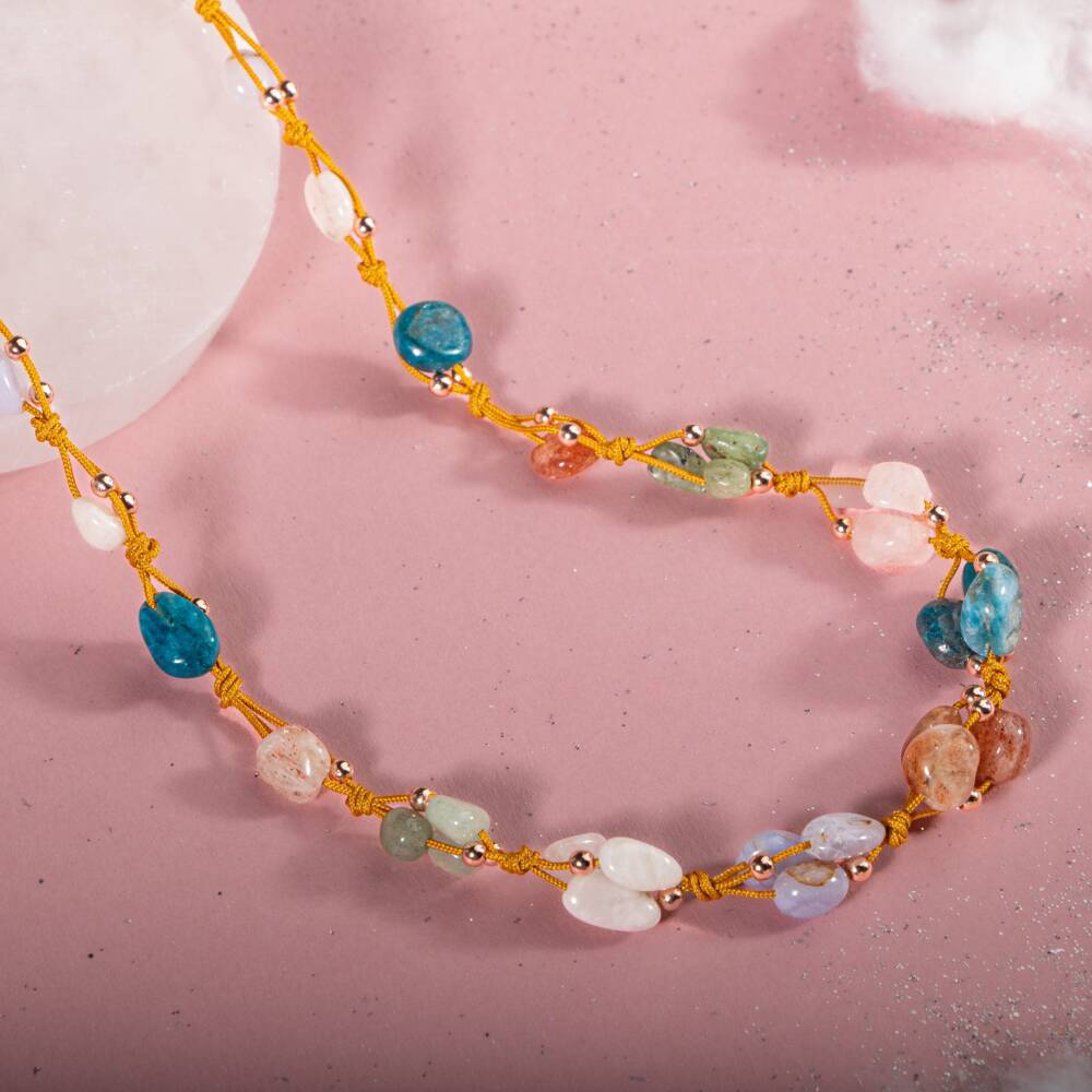 İkizler Burcu Kolye Ay Taşı, Güneş Taşı, Kalsedon, Kiyanit, Mavi Apatit, Pembe Kuvars, Yeşil Aventurin