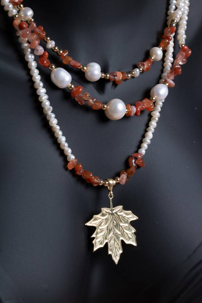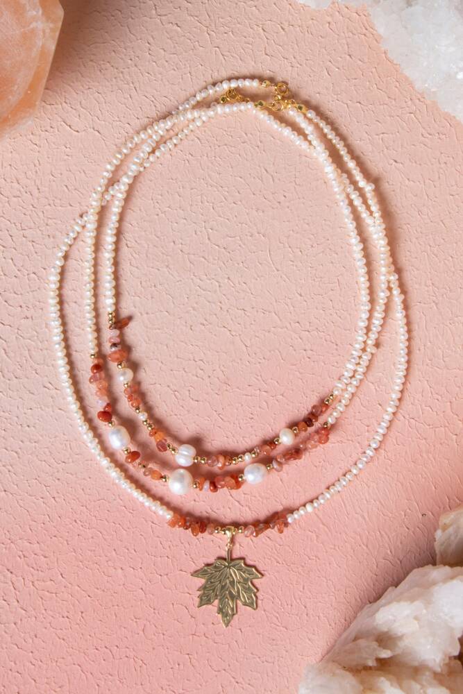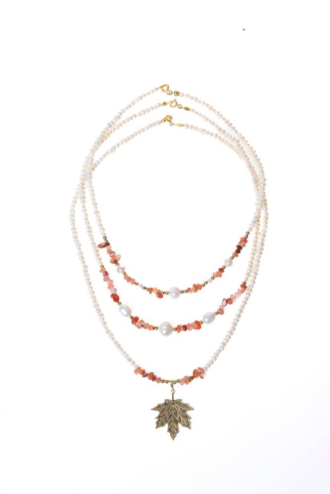 İnci, Hematit, Karnelyan Akik Gümüş Yaprak Aparatlı Doğal Taş Kolye