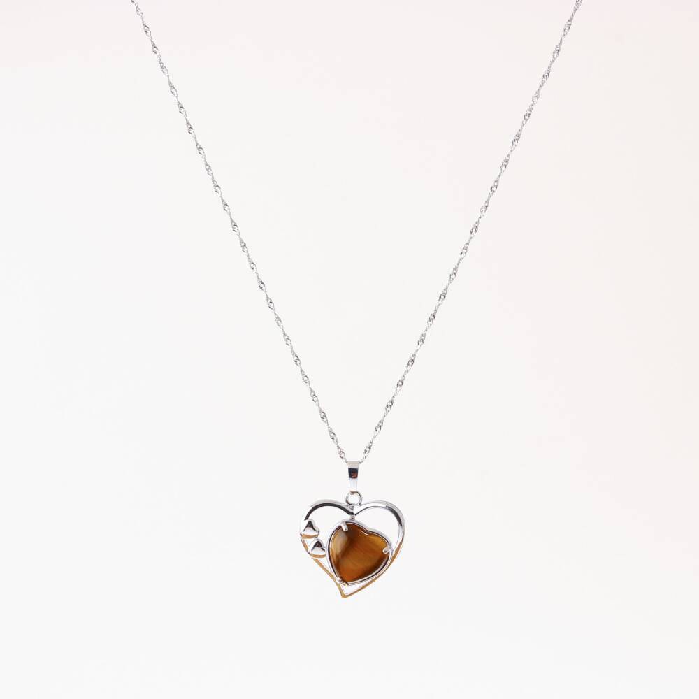 Kaplan Gözü Doğal Taş Kalpli Kolye, Gümüş Zincir