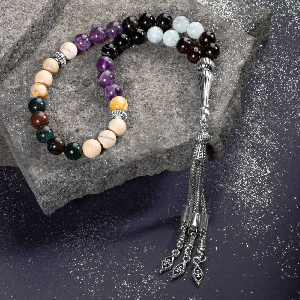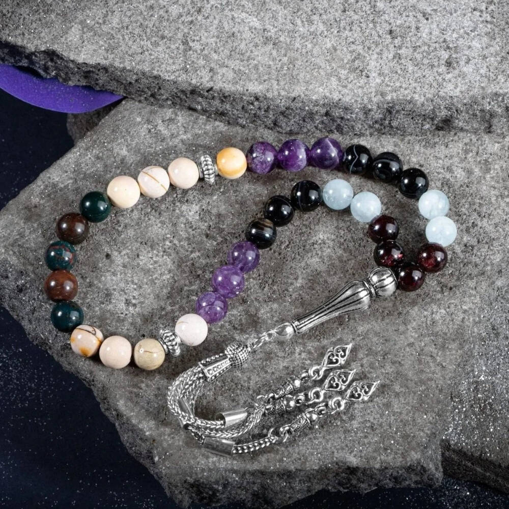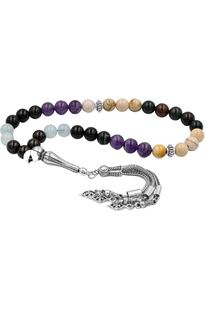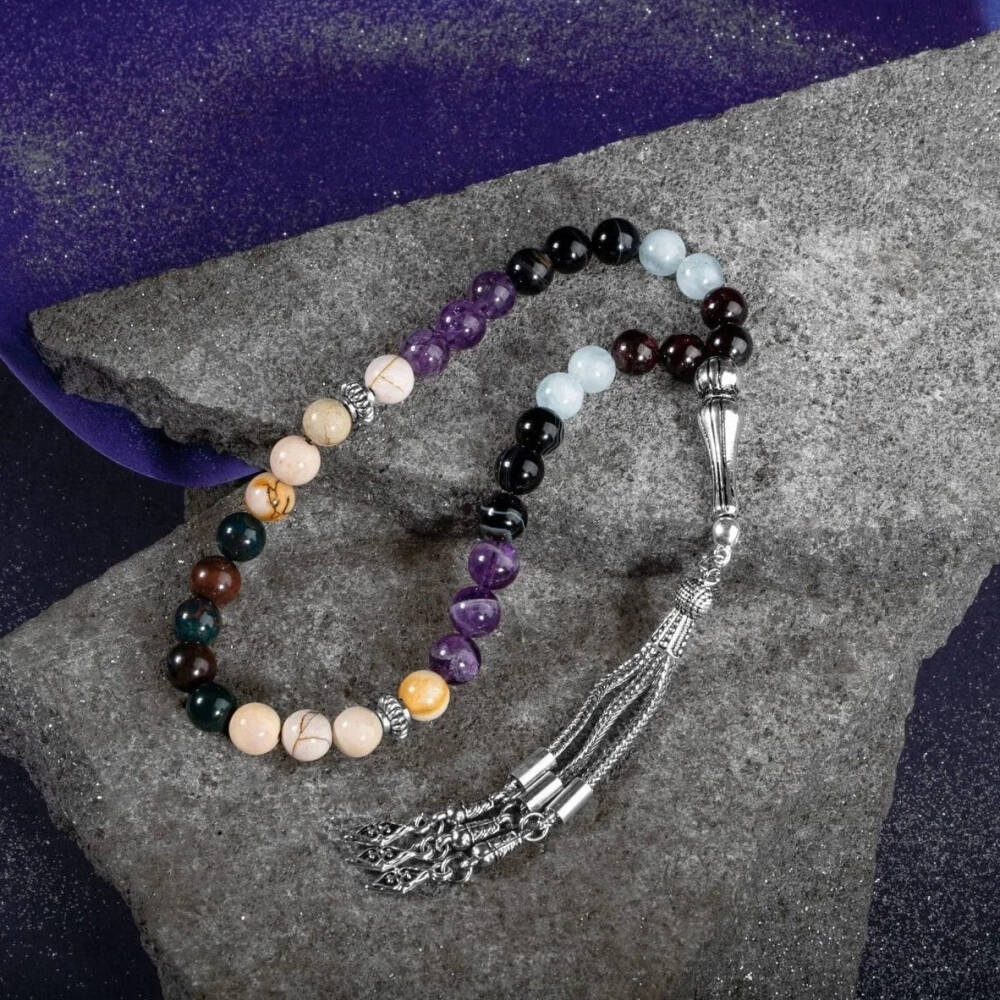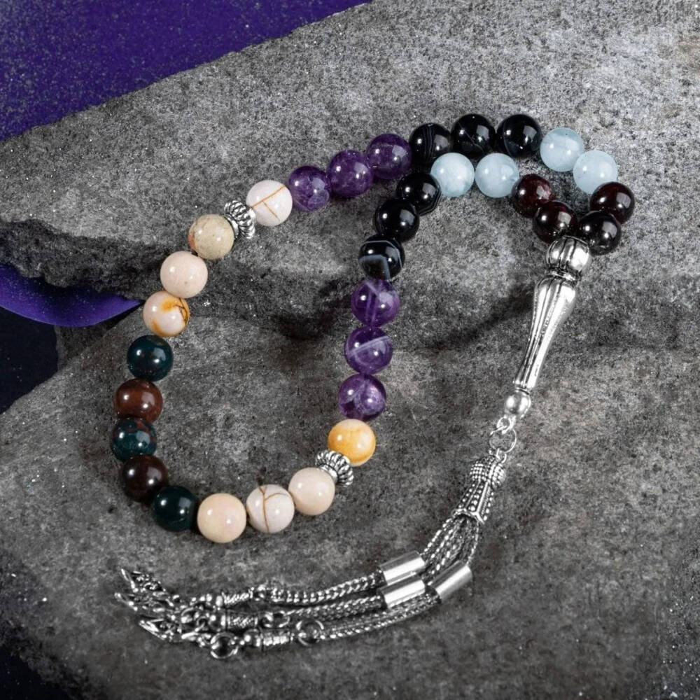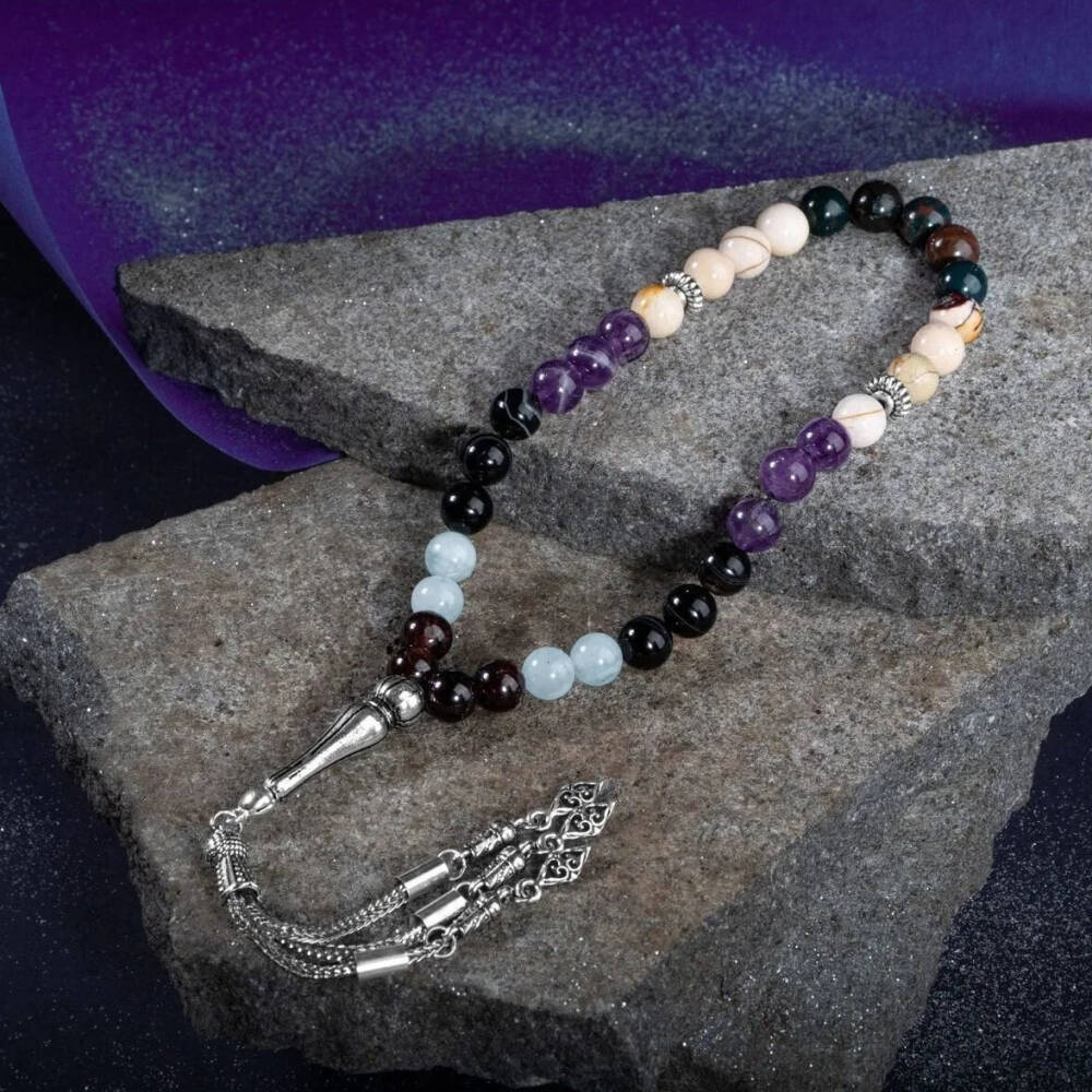 Koç Burcu Zaza Tesbih Doğal Taş Akuamarin, Ametist, Bordo Granat Lal, Kan Taşı, Sarı Jasper, Siyah Göz Akik