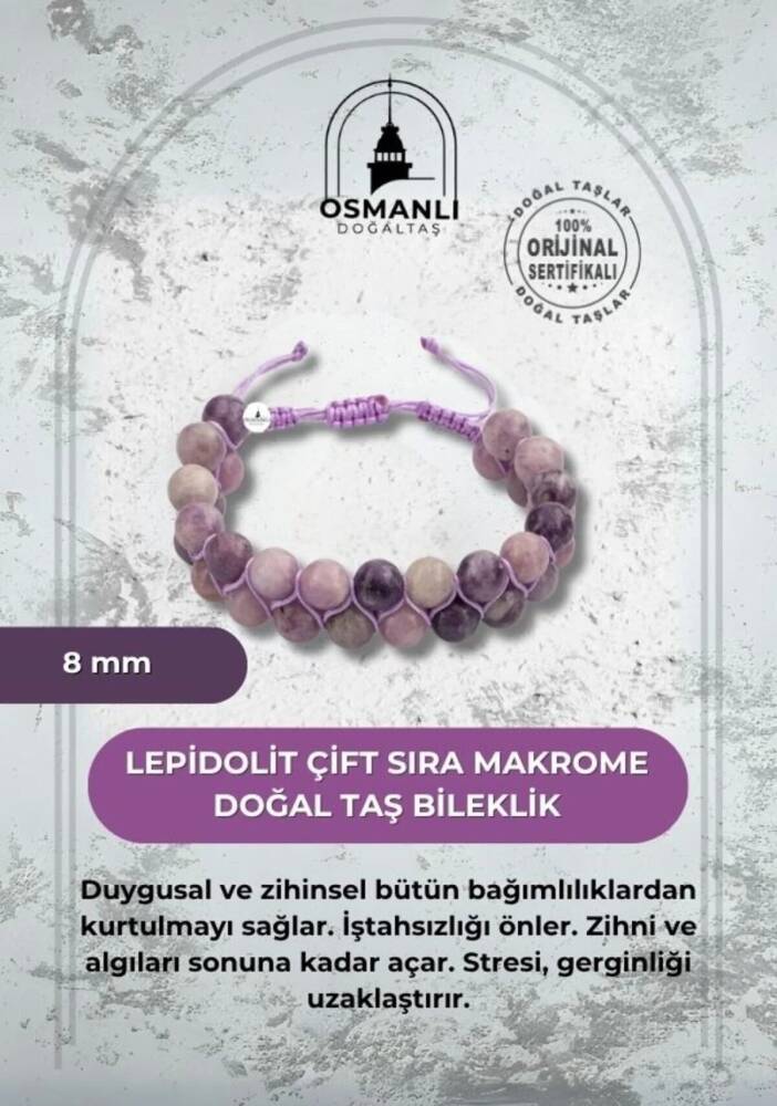 TÜM TAŞLARIMIZ SERTİFİKALI ve %100 ORJİNAL GERÇEK DOĞAL TAŞTIR. Doğal taş takılarının bu eşsiz güzelliği ve faydalarıyla müşterilerimize en kaliteli ve en özel takıları sunuyoruz. Her bir takı, tasarımcılarımız tarafından özenle hazırlanmış, doğal taşların renkleri ve enerjileri ile birlikte, size en uygun olanı seçmenizi sağlar. Doğal taş takılarımız, herhangi bir moda stiline mükemmel bir şekilde uyum sağlar. Aynı zamanda doğanın eşsiz güzelliklerini keşfetmek isteyenler için de harika bir seçenek sunarlar. Kendinizi özel hissetmek istediğinizde, doğal taş takılarımız sizin için mükemmel bir seçenek olacaktır. Ürün İçeriğindeki Taşlar Aşağıda Listelenmiştir. Lepidolit Taşı Özellikleri: Duygusal ve zihinsel bütün bağımlılıklardan kurtulmayı sağlar. İştahsızlığı önler. Zihni ve algıları sonuna kadar açar. Stresi, gerginliği uzaklaştırır. BİLGİ: Doğal taşların faydaları günümüzde birçok kullanıcıdan alınan geri dönüşlerde defeatle gözlemlenmiştir. Kan dolaşımına ve sindirim sistemine bir ilaç gibi dahil edilememesi; enerjileri ve kullanımı açısından sunacağı faydaya inanma ön koşulu gerektirmesiyle kesinlikle bir ilaç mahiyetinde değildir. Fakat geçmişten günümüze Biruni ve İbn-i Sina gibi büyük tıp alimleri doğal taşlar üzerinde düşünmüş, araştırmış ve geliştirdikleri tedavi yöntemlerine dahil etmişlerdir.Doğal taşların faydaları bilimsel bir deney-gözlem sürecinden ziyade geçmişte yaşayan toplumların ve tıp alimlerinin kullanım amaçlarına istinaden belirlenmekte, tespit edilmektedir. Biz biliyoruz ki şifa sadece Allah’tandır. Nereden ve nasıl geleceği belli olmaz. KAYNAK: Osmanlı Doğaltaş taşların özellikleri ve kullanım bilgileri için aşağıdaki kaynaklardan faydalanmaktadır.Walter Schumann, Gemstones Of The World (Sterling Yayın Evi, 17. Baskı).Judy Hall, Değerli Taşlar Kitabı (Alfa Basım Yayın, 3. Basım, 2021)Muhammed Bin Mahmud-ı Şirvani, Tuhfe-i Muradi. Hazırlayan: Mustafa Argunşah (Türk Dil Kurumu, 1999)Patrick Voillot, Elmaslar ve Değerli Taşlar (Yapı Kredi Yayınları, 1. Baskı, 2013)