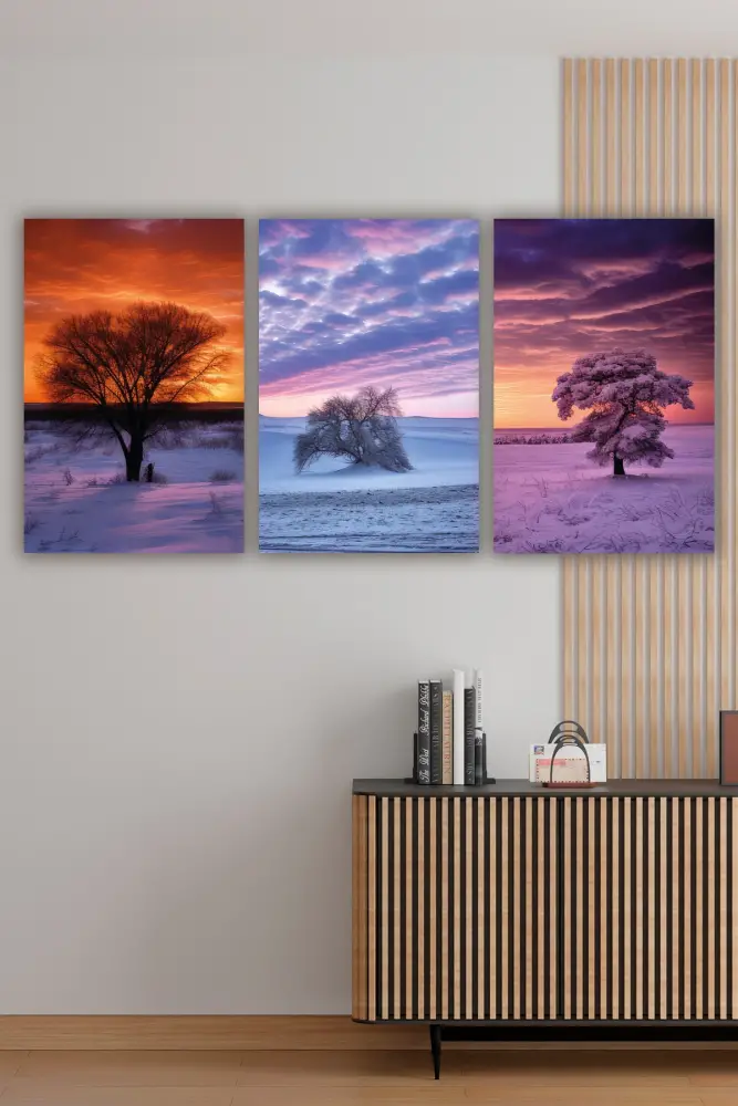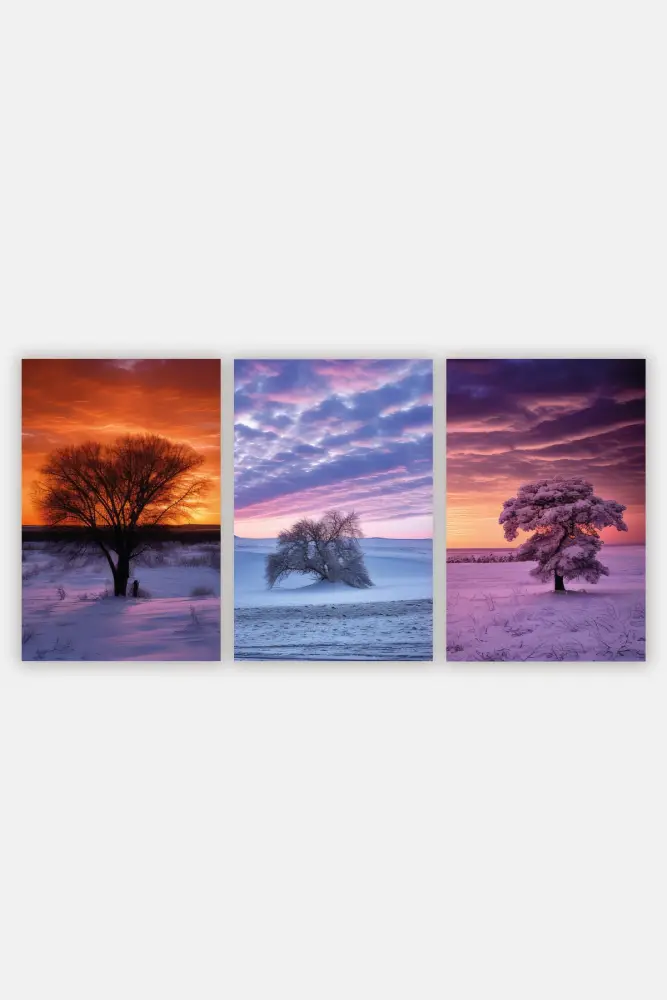 “3’lü Kar Manzaralı MDF Tablo” seti, kışın huzur veren dinginliğini ve gökyüzünün büyüleyici renklerini yaşam alanlarınıza getiriyor. Gün batımının sıcak tonları, mor ve mavi gökyüzü geçişleriyle birleşerek estetik ve modern bir dekorasyon unsuru sunuyor.