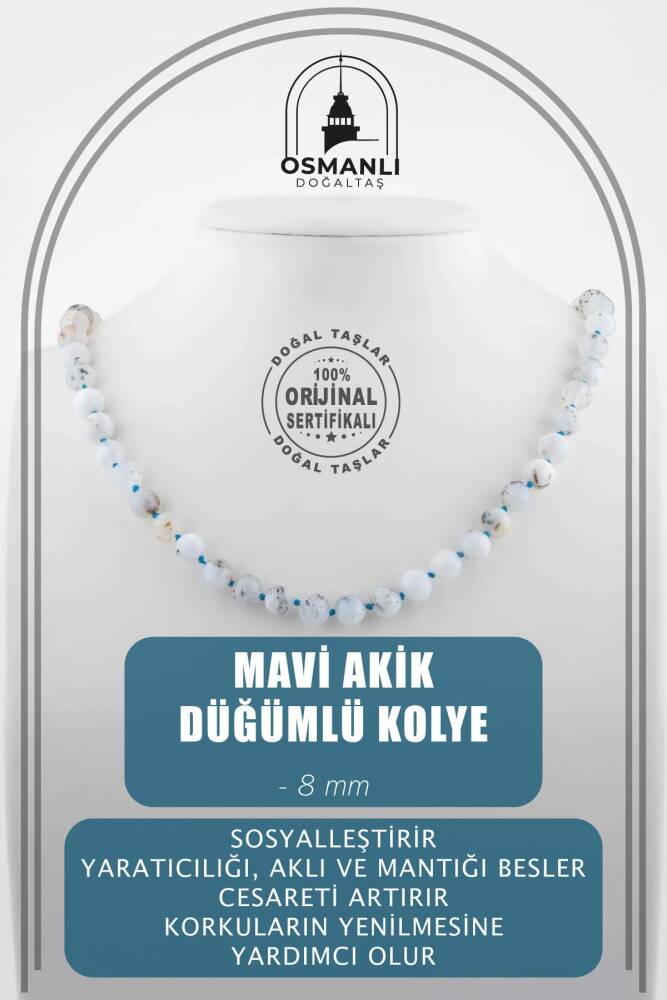 Mavi Akik 8 mm Düğümlü Doğal Taş Kolye - 1