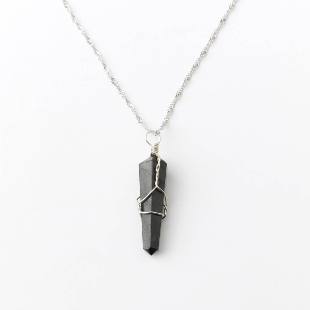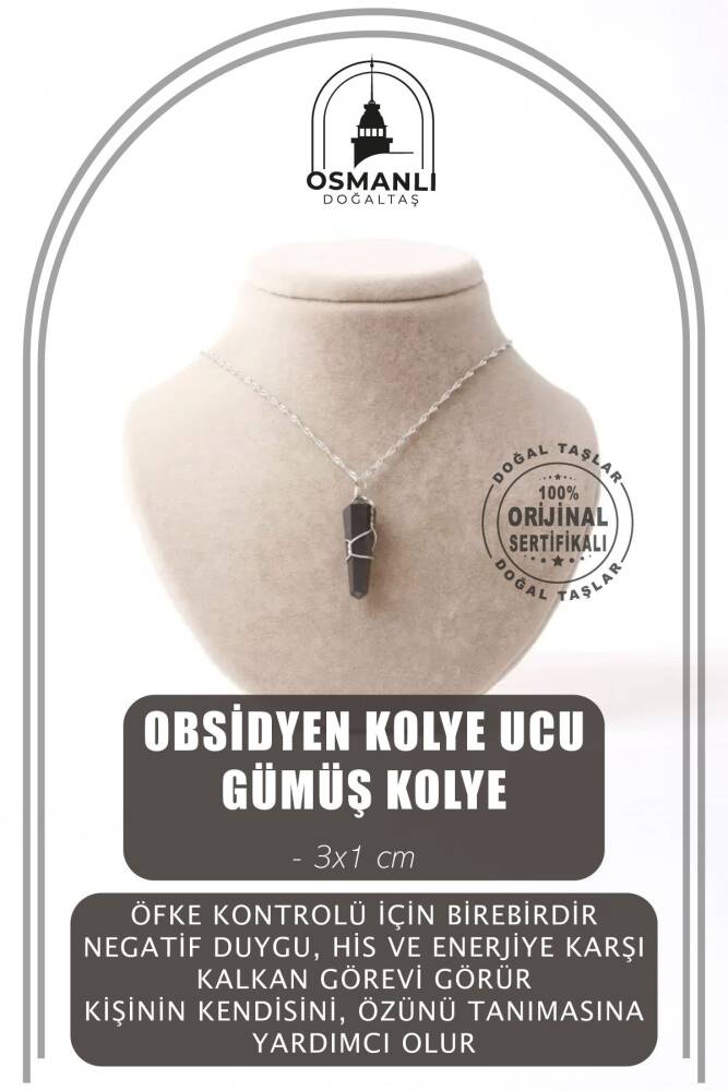 Obsidyen Doğal Taş Kolye Ucu 3x1 cm, Gümüş Zincir