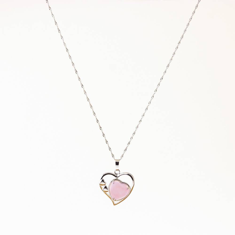 Pembe Kuvars Doğal Taş Kalpli Kolye, Gümüş Zincir - 1