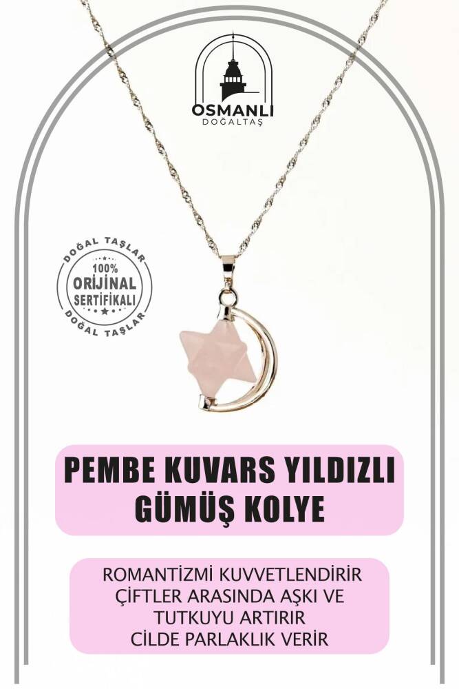 TÜM TAŞLARIMIZ SERTİFİKALI ve %100 ORJİNAL GERÇEK DOĞAL TAŞTIR.  Doğal taş takılarının bu eşsiz güzelliği ve faydalarıyla müşterilerimize en kaliteli ve en özel takıları sunuyoruz. Her bir takı, tasarımcılarımız tarafından özenle hazırlanmış, doğal taşların renkleri ve enerjileri ile birlikte, size en uygun olanı seçmenizi sağlar. Doğal taş takılarımız, herhangi bir moda stiline mükemmel bir şekilde uyum sağlar. Aynı zamanda doğanın eşsiz güzelliklerini keşfetmek isteyenler için de harika bir seçenek sunarlar. Kendinizi özel hissetmek istediğinizde, doğal taş takılarımız sizin için mükemmel bir seçenek olacaktır. Ürün İçeriğindeki Taşlar Aşağıda Listelenmiştir.    Pembe Kuvars Taşı Özellikleri: Her kadında olmazsa olmaz olan taşlardandır. Romantizmi kuvvetlendirir. Çiftler arasında aşkı ve tutkuyu artırır. Cilde parlaklık verir, güzelleştirir.       BİLGİ: Doğal taşların faydaları günümüzde birçok kullanıcıdan alınan geri dönüşlerde defeatle gözlemlenmiştir. Kan dolaşımına ve sindirim sistemine bir ilaç gibi dahil edilememesi; enerjileri ve kullanımı açısından sunacağı faydaya inanma ön koşulu gerektirmesiyle kesinlikle bir ilaç mahiyetinde değildir. Fakat geçmişten günümüze Biruni ve İbn-i Sina gibi büyük tıp alimleri doğal taşlar üzerinde düşünmüş, araştırmış ve geliştirdikleri tedavi yöntemlerine dahil etmişlerdir.Doğal taşların faydaları bilimsel bir deney-gözlem sürecinden ziyade geçmişte yaşayan toplumların ve tıp alimlerinin kullanım amaçlarına istinaden belirlenmekte, tespit edilmektedir. Bil biliyoruz ki şifa sadece Allah’tandır. Nereden ve nasıl geleceği belli olmaz.    KAYNAK: Osmanlı Doğaltaş taşların özellikleri ve kullanım bilgileri için aşağıdaki kaynaklardan faydalanmaktadır.Walter Schumann, Gemstones Of The World (Sterling Yayın Evi, 17. Baskı).Judy Hall, Değerli Taşlar Kitabı (Alfa Basım Yayın, 3. Basım, 2021)Muhammed Bin Mahmud-ı Şirvani, Tuhfe-i Muradi. Hazırlayan: Mustafa Argunşah (Türk Dil Kurumu, 1999)Patrick Voillot, Elmaslar ve Değerli Taşlar (Yapı Kredi Yayınları, 1. Baskı, 2013)