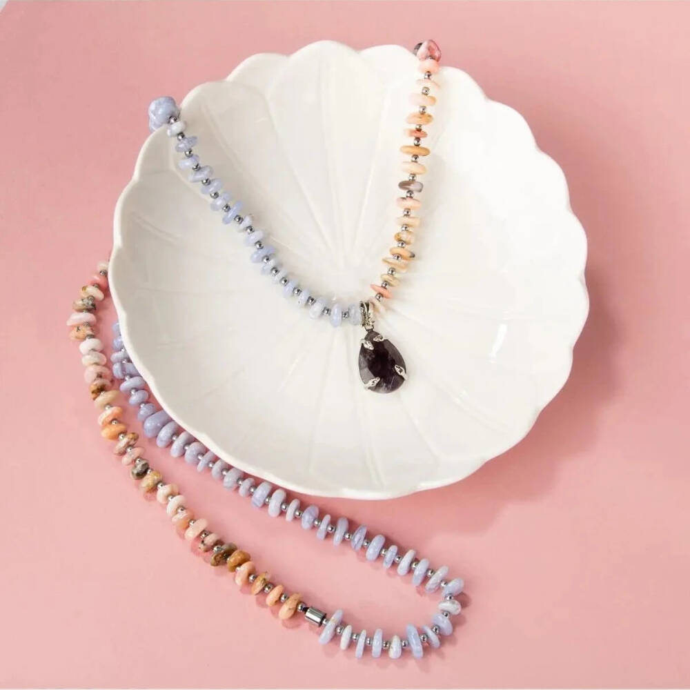 TÜM TAŞLARIMIZ SERTİFİKALI ve %100 ORJİNAL GERÇEK DOĞAL TAŞTIR. Doğal taş takılarının bu eşsiz güzelliği ve faydalarıyla müşterilerimize en kaliteli ve en özel takıları sunuyoruz. Her bir takı, tasarımcılarımız tarafından özenle hazırlanmış, doğal taşların renkleri ve enerjileri ile birlikte, size en uygun olanı seçmenizi sağlar. Doğal taş takılarımız, herhangi bir moda stiline mükemmel bir şekilde uyum sağlar. Aynı zamanda doğanın eşsiz güzelliklerini keşfetmek isteyenler için de harika bir seçenek sunarlar. Kendinizi özel hissetmek istediğinizde, doğal taş takılarımız sizin için mükemmel bir seçenek olacaktır. Ürün İçeriğindeki Taşlar Aşağıda Listelenmiştir. Mavi Akik Taşı Özellikleri: Sosyalleştirir. Yaratıcılığı, aklı ve mantığı besler. Cesareti artırır, korkuların yenilmesine yardımcı olur. Odaklanmayı artırır. Pozitif enerji verir: Rahatlatır. Stresi Giderir. Pembe Opal Taşı Özellikleri: Sadakati artırır. İfade etme becerisini yükseltir. Spontane gelişimleri açar. Duyguları yoğunlaştırır, engelleri kaldırır. Hematit Taşı Özellikleri: Hayatta kalma iç güdüsünü artırır. Cesaret, irade ve özgüven duygularını artırır. Cesaret, irade ve özgüven duygularını yükseltir. Ametist Taşı Özellikleri: Bağışıklığı yükseltir, sakinleştirici ve rahatlatıcıdır, uyku problemlerine giderir ve yoğun duygu ataklarını önler.