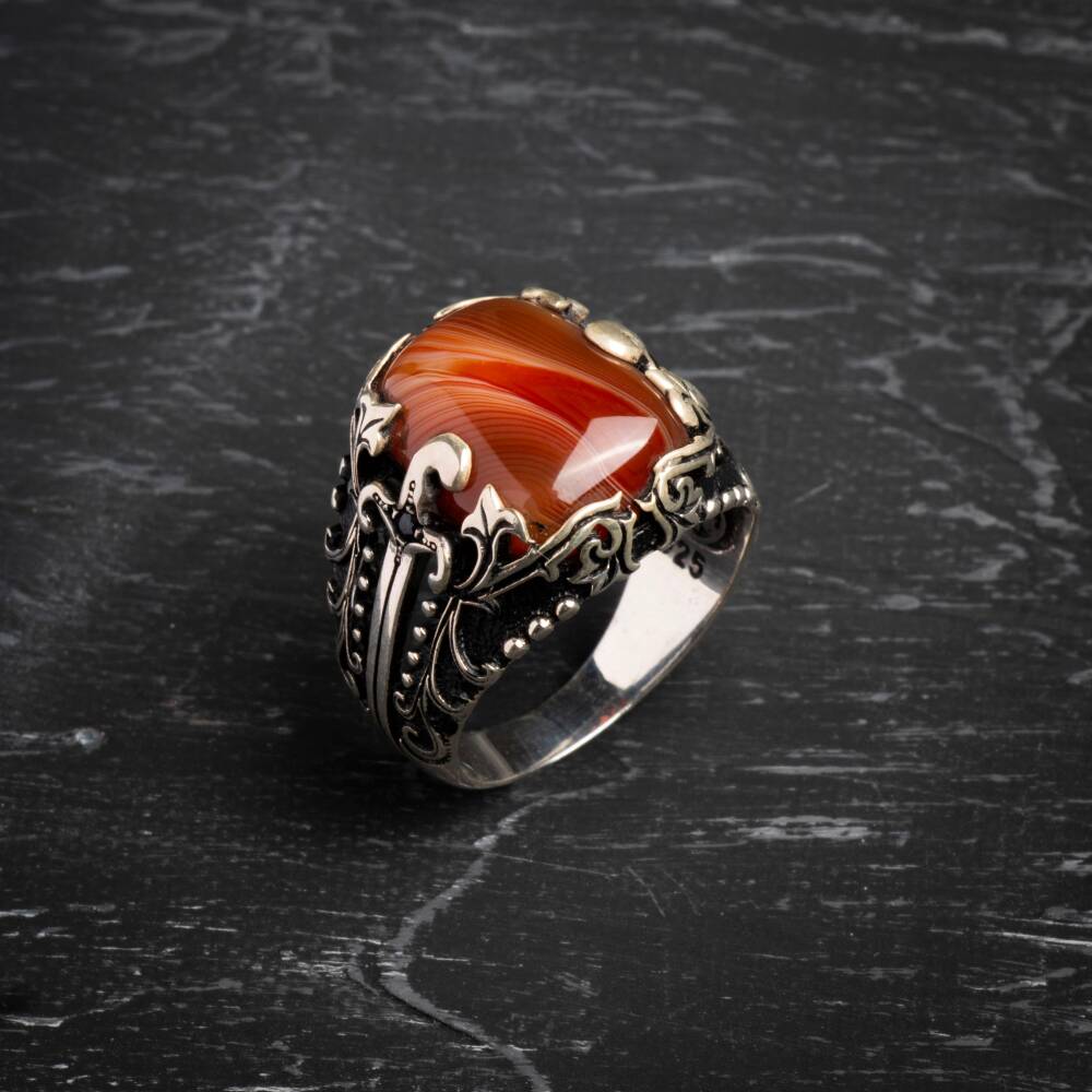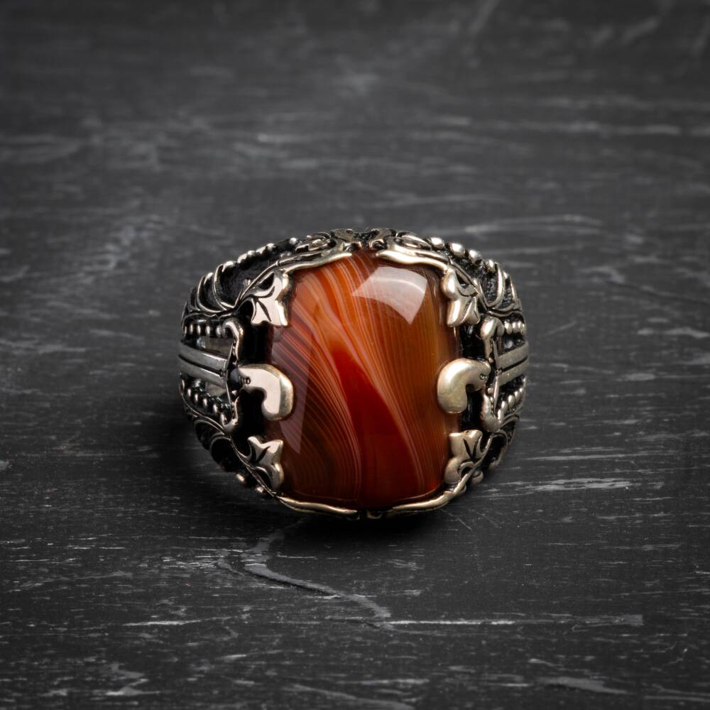Sertifikalı 925 Ayar Motifli Akik Doğal Taş Yüzük (Erkek) Güç, koruma ve kararlılığın sembolü olan Akik doğal taşının eşsiz enerjisiyle tanışın. Yüzüğümüz, Sertifikalı 925 Ayar Gümüş üzerine şık Özel Motifler ile bezenmiş olup, hem asil bir duruş hem de ruhsal denge sağlayan güçlü bir aksesuardır. Akik Taşının Gücü ve Yüzüğün Özellikleri Akik (Koruma ve Denge): Akik, güçlü bir koruyucu taştır. Negatif enerjilere karşı kalkan görevi görür, duygusal, fiziksel ve zihinsel dengeyi sağlamaya yardımcı olur. Kararlılığı ve özgüveni destekler. Sertifikalı Güvenilirlik: Yüzüğün taşı sertifikalı olup, orijinalliği ve kalitesi garantilenmiştir. Kullanılan gümüş ise yüksek standartlı 925 Ayar saflığındadır. Özel Motifli Tasarım: Yüzük kasası, modern ve geleneksel unsurları birleştiren özel motifler ile süslenmiştir. Bu detaylar, yüzüğe sofistike ve karizmatik bir hava katar. Asil ve Erkeksil Duruş: Akik taşının derin ve doğal renk tonları ile gümüşün asil parlaklığı, güçlü ve karizmatik bir erkek stilini tamamlar. Bu özel yüzük, hem sanatsal estetiği hem de Akik taşının güçlü enerjisini bir araya getirerek günlük yaşamda size destek olur.