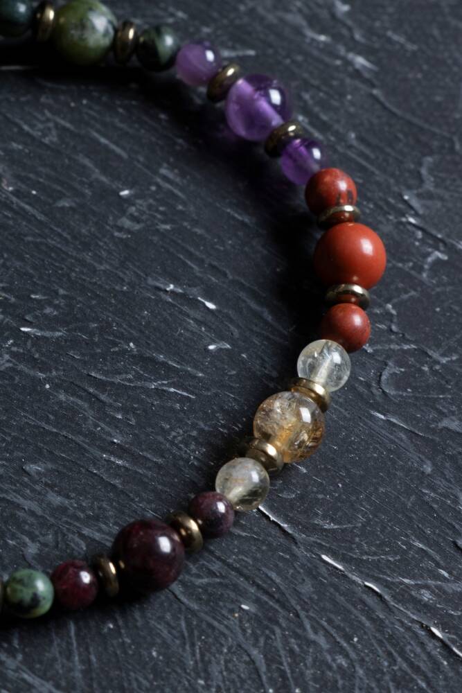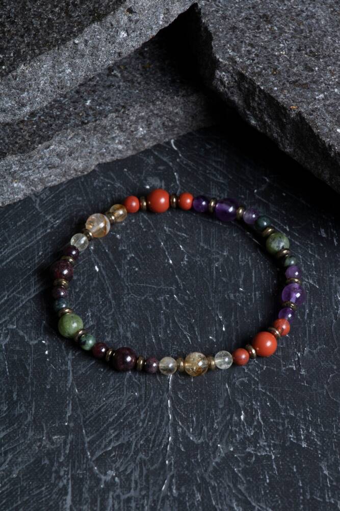 Zodyak'ın en derin, sezgisel ve kararlı burcu olan Akrepler için özel olarak seçilen; Jasper, Ametist, Yeşim, Sitrin ve Lal (Garnet) taşları bu eşsiz misinalı tasarımda bir araya geldi. Bu bileklik, Akrep burcunun yoğun duygusal dünyasını dengelerken, ona hem ruhsal bir koruma hem de sarsılmaz bir irade sunmak için tasarlandı.