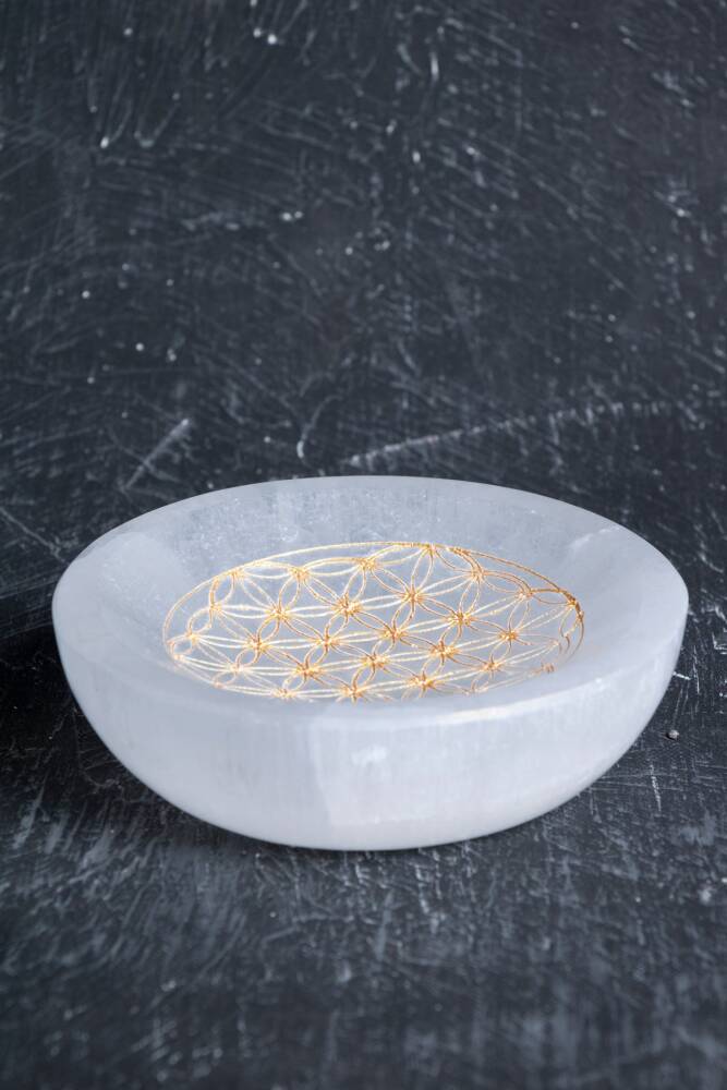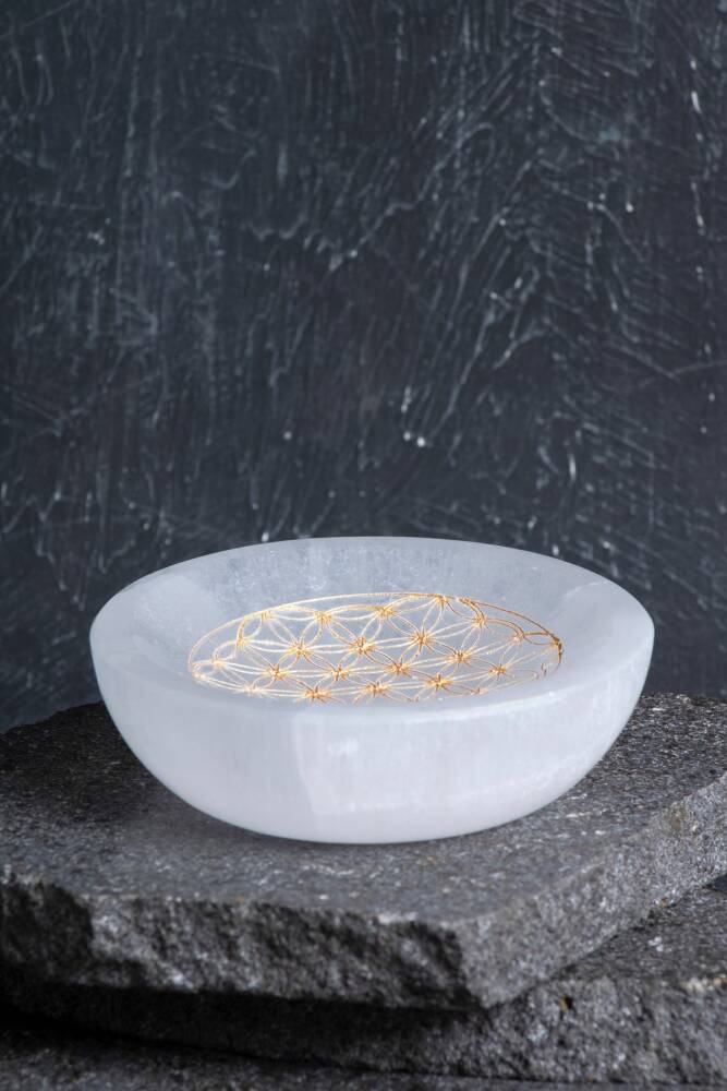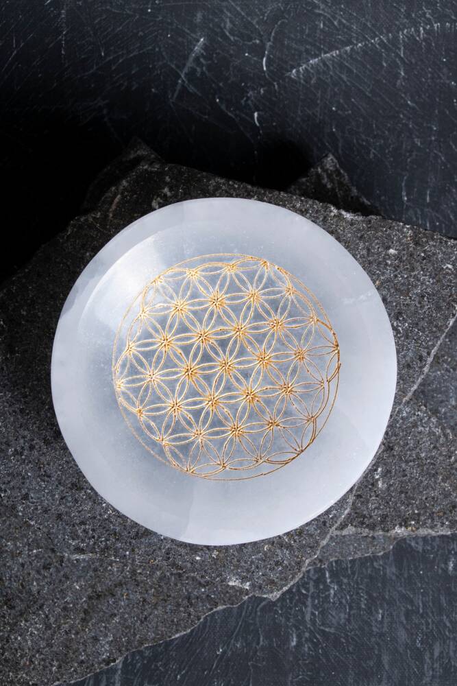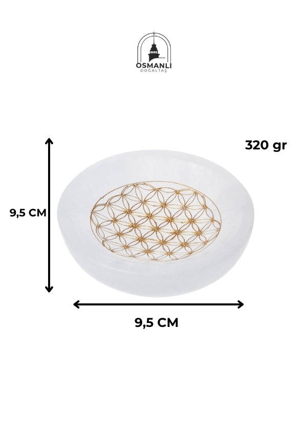 Bolluk ve Zenginlik Enerjisi: Tabağın üzerindeki Altın Renkli Motifler, finansal çekim ve bolluk enerjisini temsil eder. Selenit'in saflığı ile Altın'ın pozitif titreşimleri birleşerek bulunduğu ortama refah ve iyimserlik yayar.