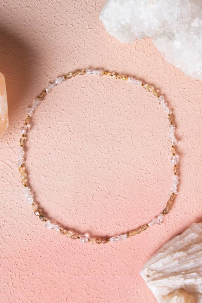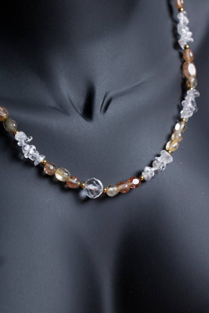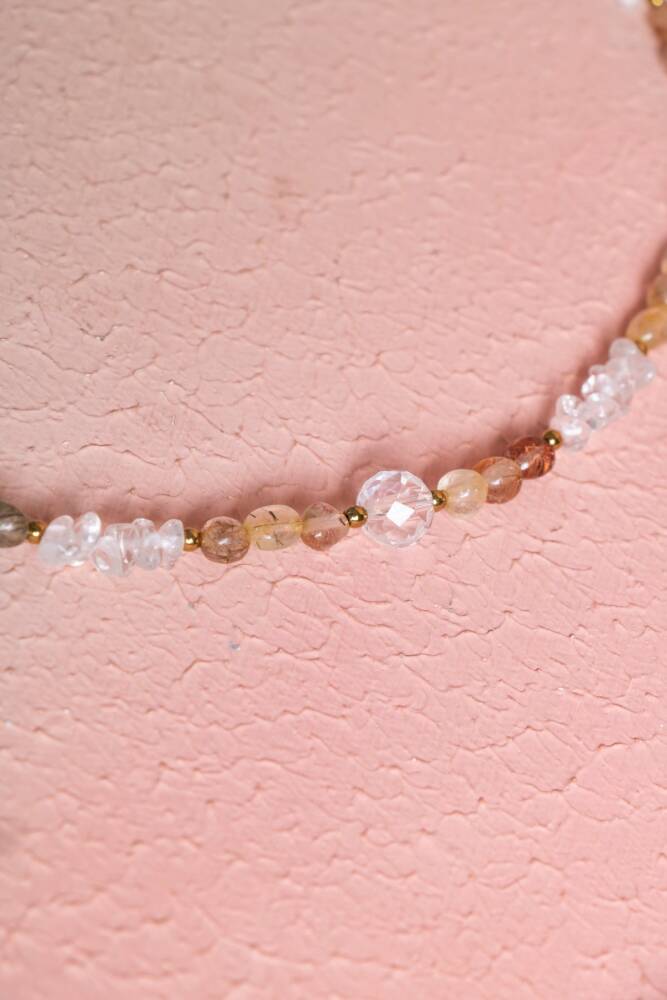 Kolyedeki taşların farklı doku ve renkleri (rutilin parlaklığı, kuvarsın berraklığı, hematitin metalikliği), organik ve sofistike bir estetik yaratır. Bu özel kombinasyon, günlük kullanımınızda size eşlik ederken enerjinizi sürekli olarak yüksek tutar ve dengeler.