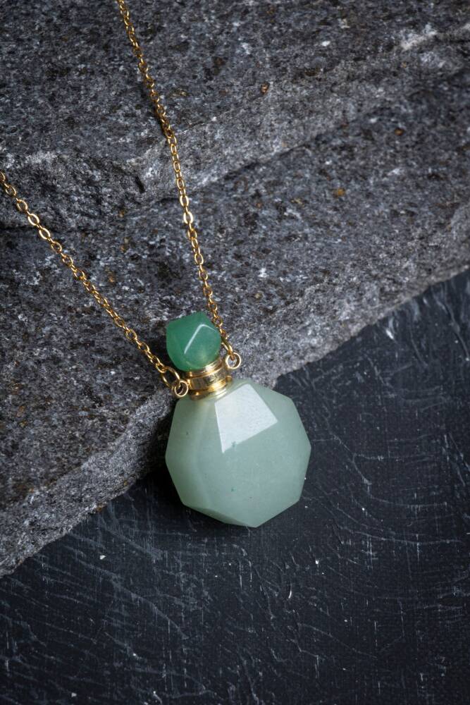 Bu özel şişe, orijinal ve kalitesi onaylanmış gerçek Aventurin taşı kullanılarak üretilmiştir. Favori esansiyel yağlarınızı her an yanınızda taşımanızı sağlarken, aynı zamanda Aventurinin doğal enerjilerinden sürekli olarak faydalanmanızı sağlar.