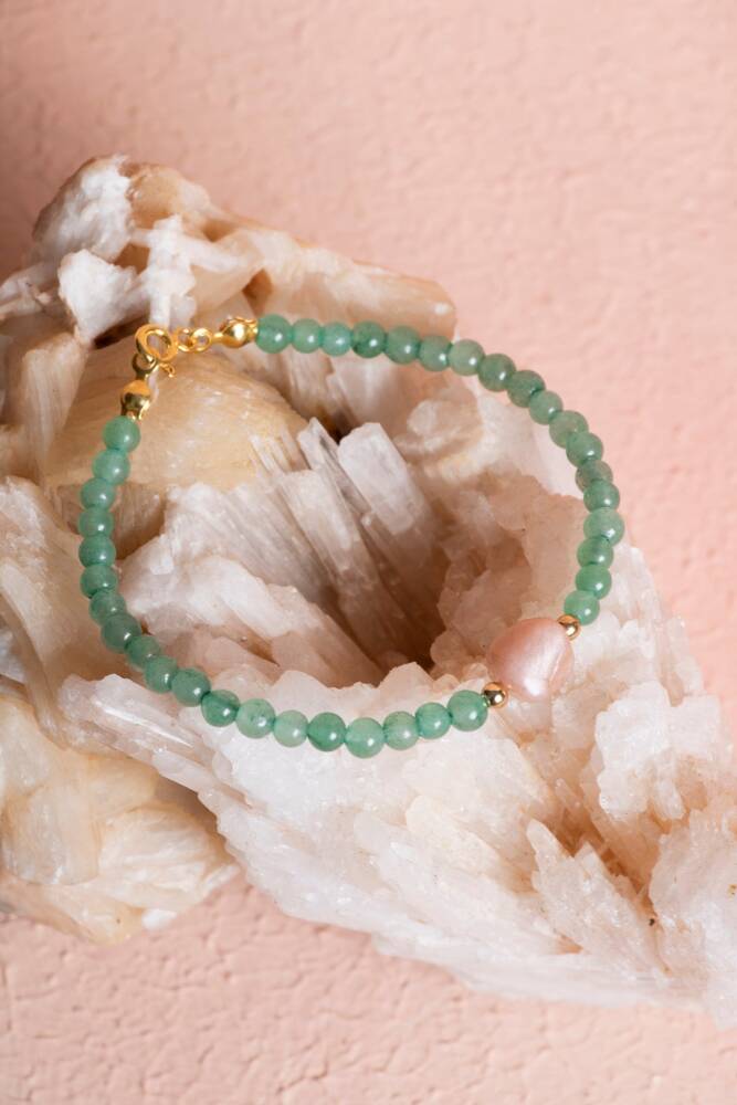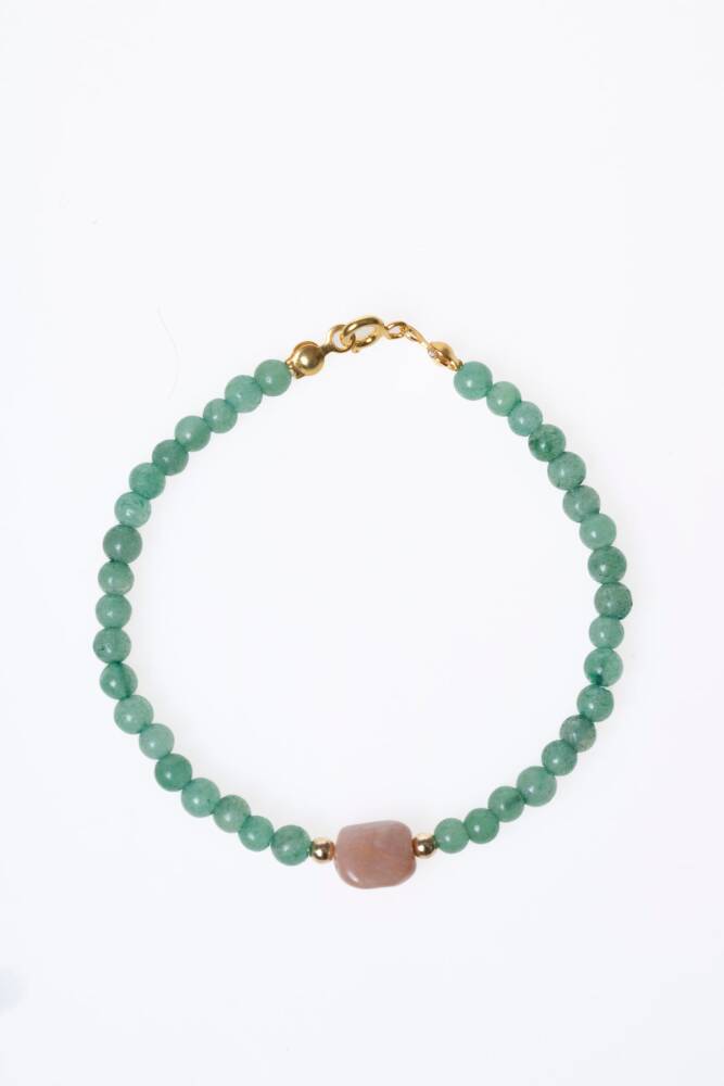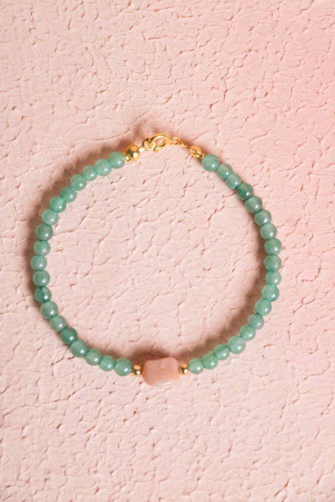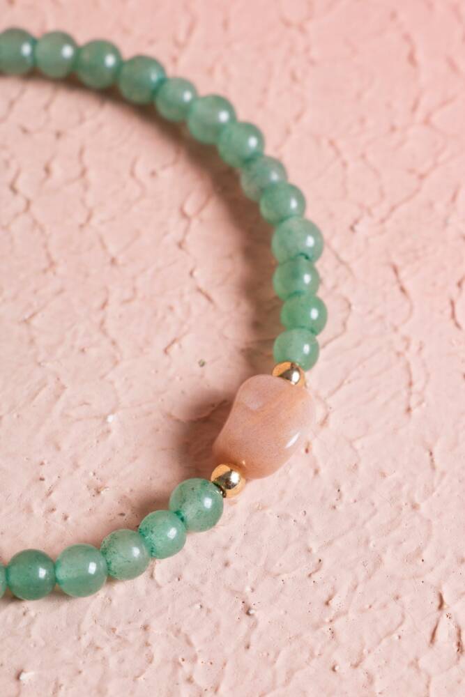 Aventurin'in huzur veren yeşil tonları ile Güneş Taşı'nın sıcak, ışıltılı turuncu tonları, dinamik ve göz alıcı bir uyum yakalar. Bu bileklik, enerjinizi sürekli olarak pozitif ve dengede tutar.
