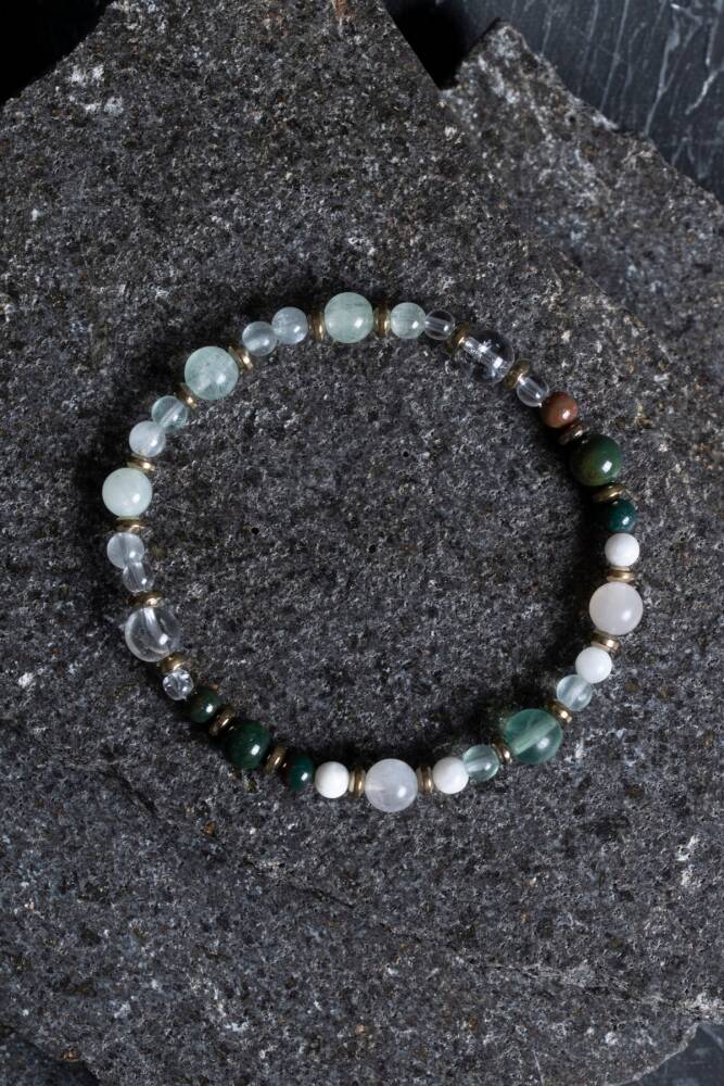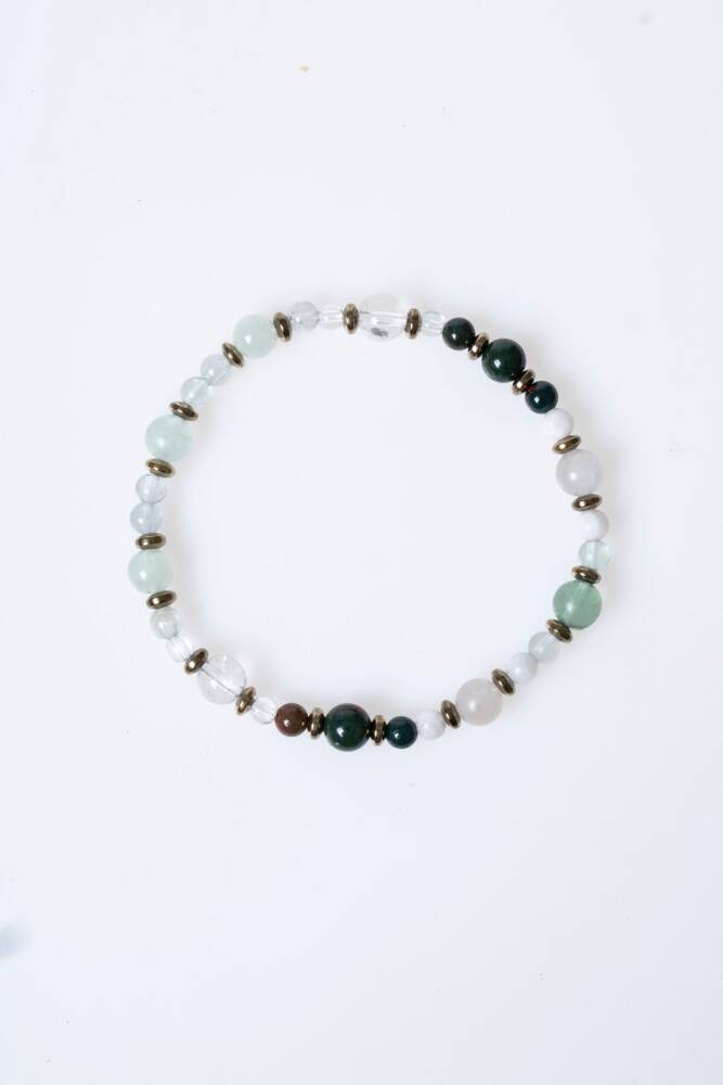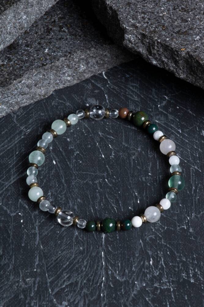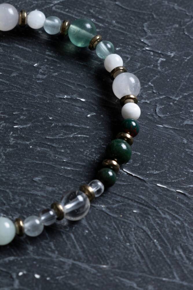 Zodyak'ın en hassas, sezgisel ve merhametli burcu olan Balıklar için özel olarak seçilen; Florit, Kristal Kuvars, Kan Taşı, Ay Taşı ve Akuamarin taşları bu eşsiz misinalı tasarımda buluştu. Bu bileklik, Balık burcunun spiritüel yönünü güçlendirirken, duygusal dalgalanmalarını dengelemek ve ona zihinsel netlik sunmak için tasarlandı.