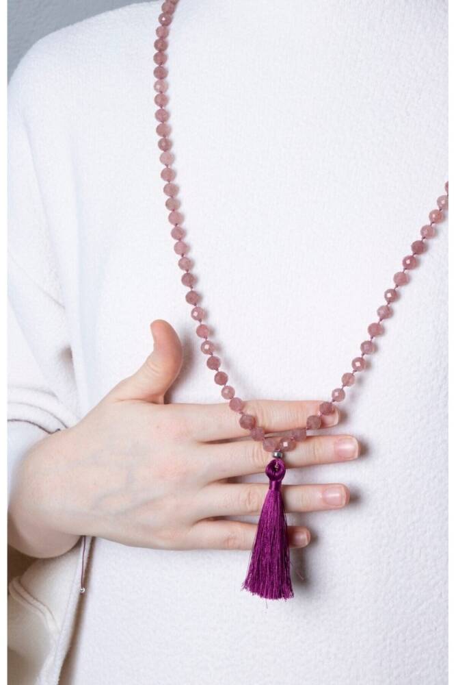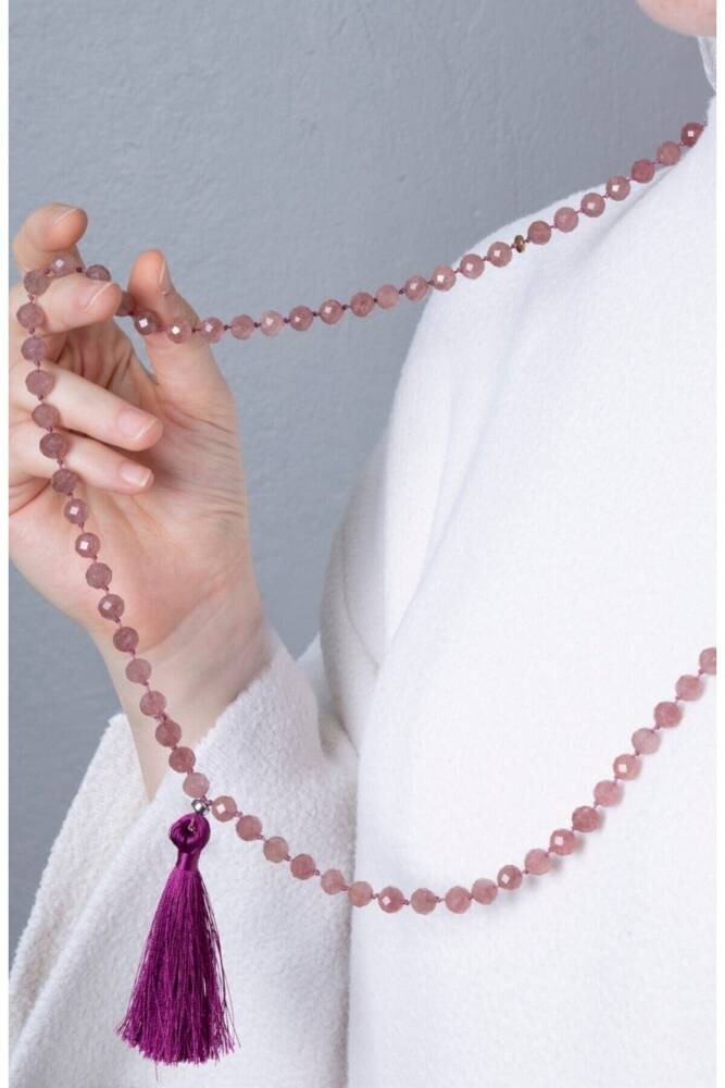 Çilek Kuvars Elmas Kesim Fasetli Doğal Taş 99'luk Tesbih Kolye (8mm) Işığın dansı ve sevginin enerjisiyle bezenmiş 99 duraklı bir huzur yolculuğu. Usta işi faset (elmas) kesim ile işlenmiş 8mm boyutundaki Çilek Kuvars taşları, bu 99’luk tasarımda hem geleneksel tesbih formunu hem de modern bir kolye estetiğini bir araya getiriyor. Taşların üzerindeki yüzlerce kesik yüzey, ışığı her açıdan kırarak boynunuzda ve elinizde göz alıcı bir parıltı oluşturur. Taşın ve Formun Özellikleri Çilek Kuvars (Strawberry Quartz): İçindeki mikro-kristal inklüzyonlar sayesinde doğal bir pembe/kırmızı pırıltıya sahiptir. Kalp çakrasını aktive ederek neşe, sevgi ve yaşama arzusu aşılar. 8mm İdeal Boyut: Taşların 8mm olması, hem tesbih çekerken parmaklar arasında tok ve konforlu bir his verir hem de kolye olarak kullanıldığında boyunda belirgin ve zengin bir duruş sergiler. 99'luk Geleneksel Dizim: Uzun yapısı sayesinde boyuna iki tur dolanarak şık bir katmanlı kolye olarak kullanılabilir veya meditasyon/zikir süreçlerinde tam bir devir sağlar. Fasetli Kesim Gücü: Düz taşlara oranla enerjiyi daha geniş bir alana yansıtır. Her bir taşın parıltısı, takıya mücevher kalitesi katar. Tasarım Detayları Kaliteli İşçilik: Taşlar, kopmaya karşı ekstra dayanıklı profesyonel takı ipi ile düğümleme tekniği (isteğe bağlı) veya yüksek dirençli kordon üzerine dizilmiştir. İmame ve Duraklar: Tasarımı tamamlayan şık bir imame ve her 33 taşta bir yerleştirilen özel ayraçlar (nişaneler), kullanım kolaylığı sağlar. Unisex ve Zarif: Pembenin en doğal ve vakur tonunu barındırdığı için hem kadın hem erkek kullanıcılar için ruhsal bir aksesuar niteliğindedir. Neden Bu Tasarımı Tercih Etmelisiniz? Fonksiyonel Şıklık: Gün boyu boynunuzda yüksek frekanslı bir kolye olarak taşıyabilir, ihtiyaç duyduğunuzda manevi bir odaklanma aracı olarak kullanabilirsiniz. Duygusal Arınma: Çilek Kuvars'ın yatıştırıcı enerjisi, 99'luk dizimin getirdiği sabır ve ritimle birleştiğinde zihinsel bir detoks sağlar. Koleksiyonluk Parça: Fasetli kesimi ve taş kalitesiyle, uzun yıllar değerini koruyacak özel bir parçadır.