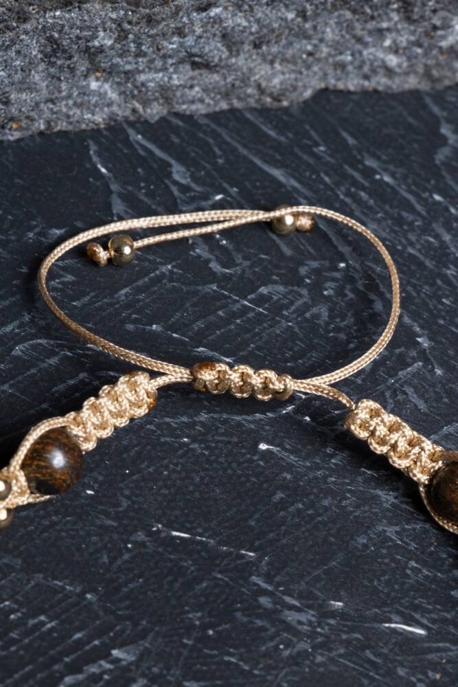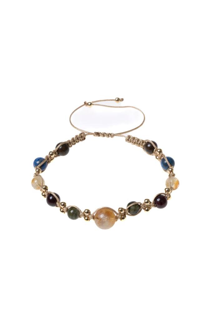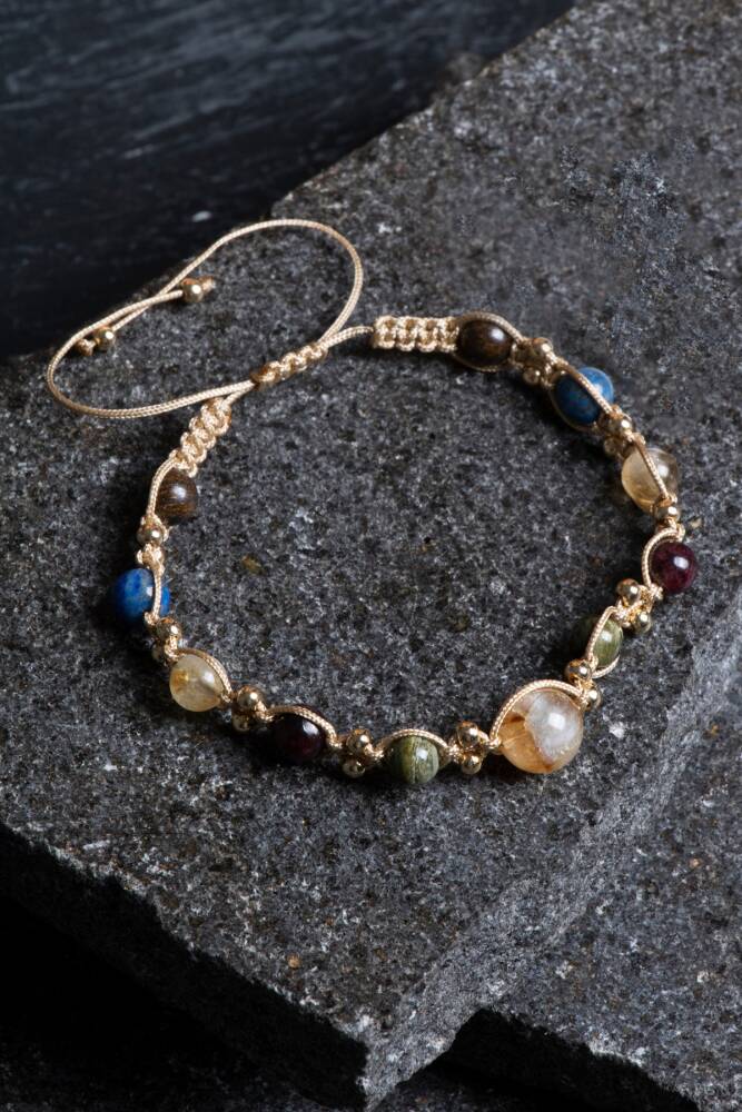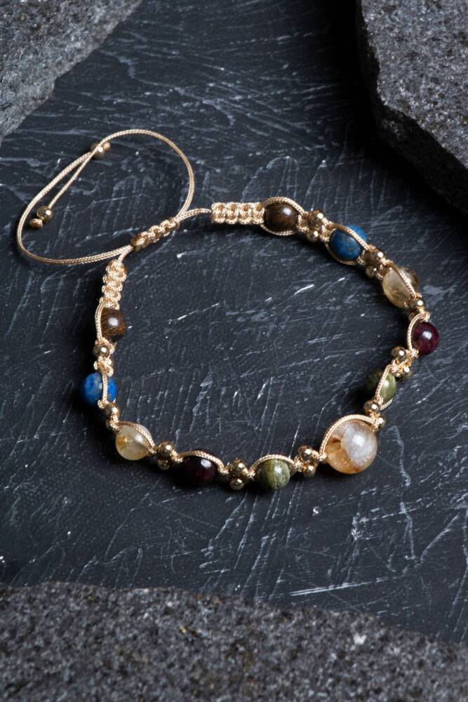 Bu beş taşın güçlü birleşimi, Aslan burcunun doğal parıltısını destekleyen dengeli, güçlü ve enerjik bir alan oluşturur. %100 doğal ve sertifikalı taşlarla üretilmiş bu bileklik, el işçiliğiyle örülmüş makrome tasarımı sayesinde hem konforlu hem stil sahibi bir kullanım sunar.