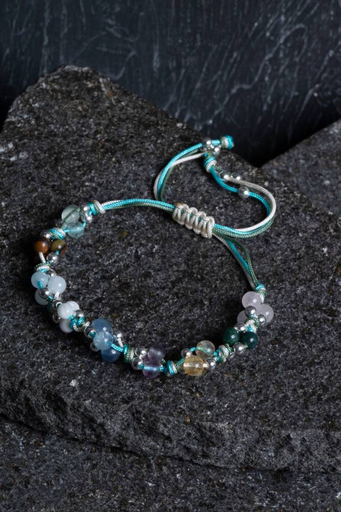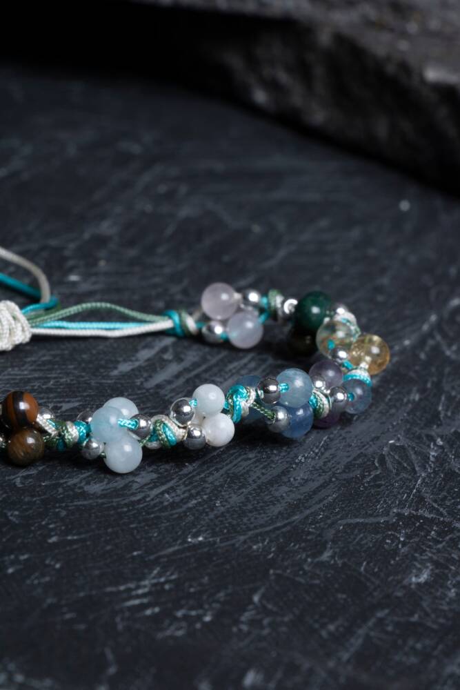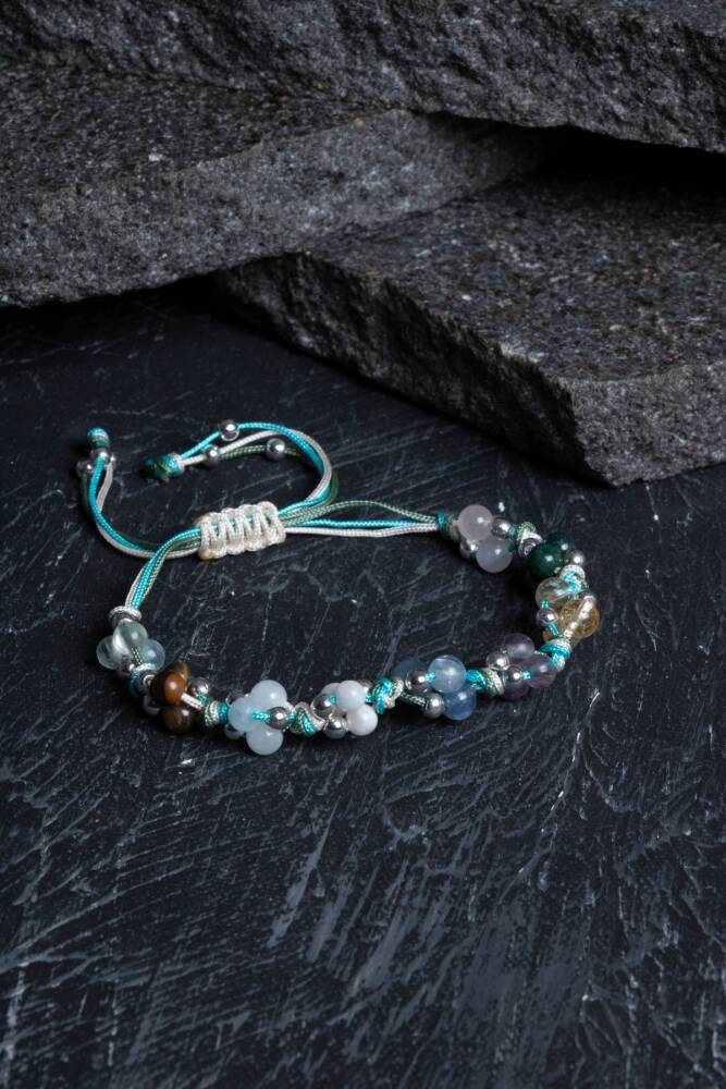 Balık burcunun duygusal, sezgisel ve şefkatli karakterini yansıtan bu özel makrome bileklik; Pembe Kuvars, Kan Taşı, Sitrin, Florit, Akuamarin, Ay Taşı, Kaplan Gözü ve Kyanit taşlarının uyumuyla tasarlandı. El işçiliğiyle hazırlanan bu bileklik, %100 doğal ve sertifikalı taşlarla hem ruhsal destek hem de zarif bir görünüm sunar.
