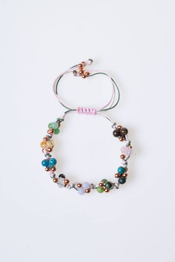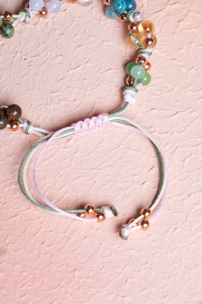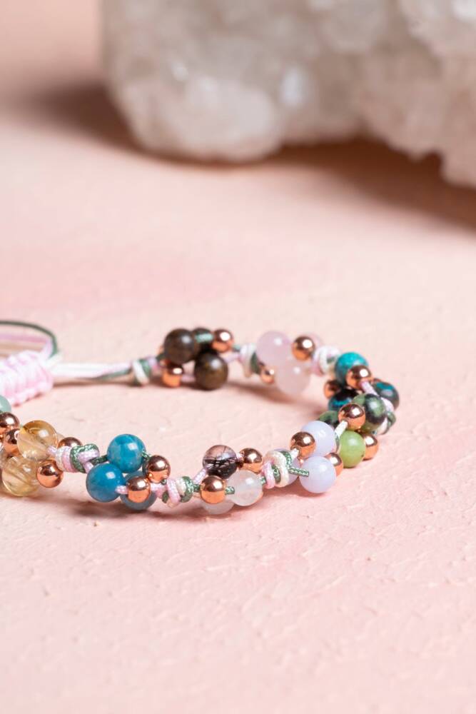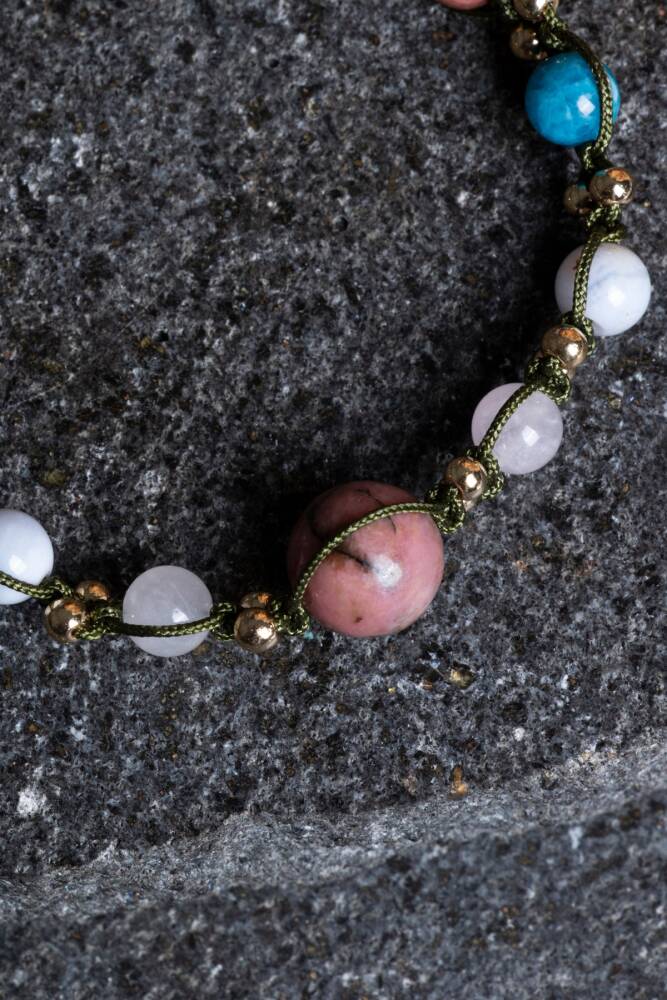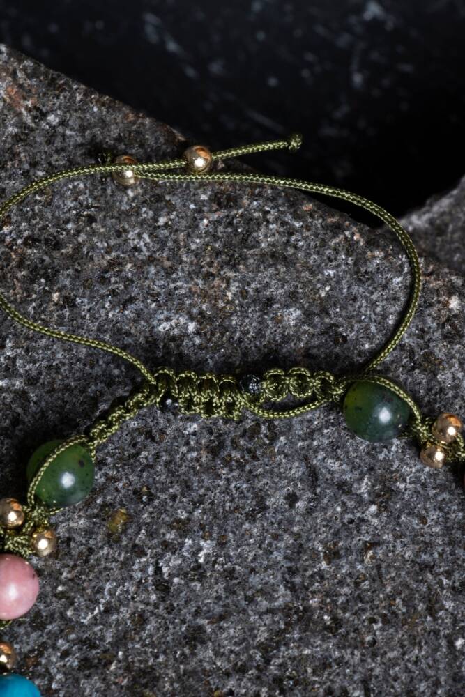 Bu özel makrome bileklik, Boğa burcunun doğayla uyumlu, sabırlı, güven arayan ve estetik zevklere sahip karakterini yansıtan doğal taşlarla tasarlandı: