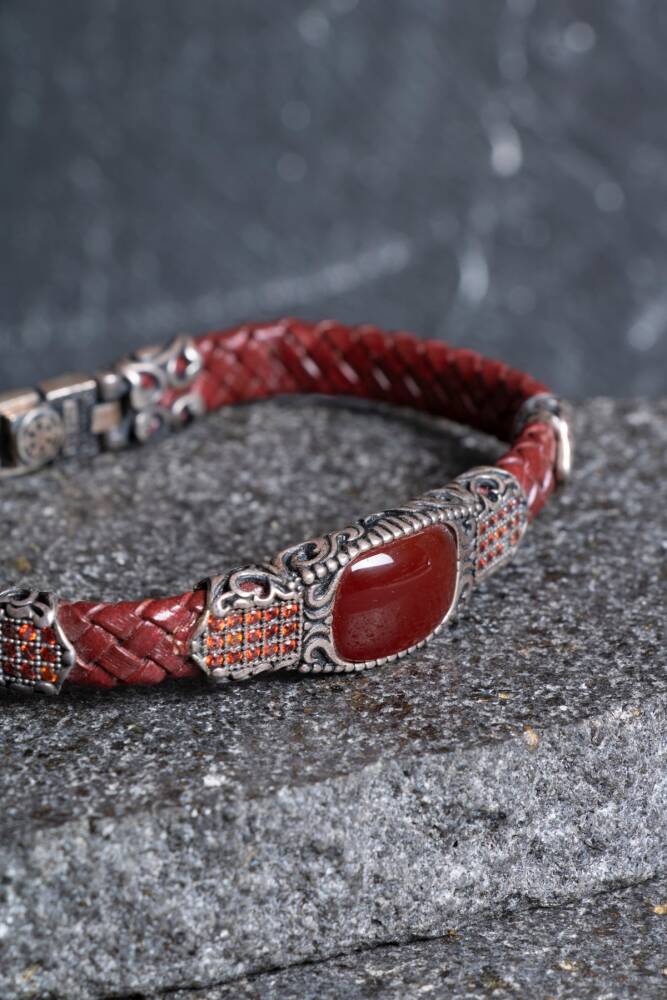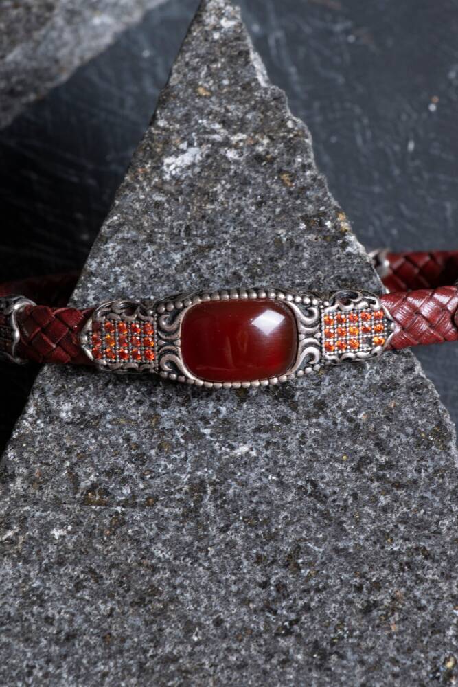 Usta ellerde titizlikle şekillendirilen El İşçiliği Gümüş detaylar, koruyucu enerjisiyle bilinen Akik taşı ve hakiki derinin zamansız dokusu bu özel tasarımda bir araya geldi. Her bir düğümü, her bir gümüş kakması ayrı bir özenle hazırlanan bu bileklik; tarzında özgünlük, karakterinde derinlik arayanlar için üretildi.