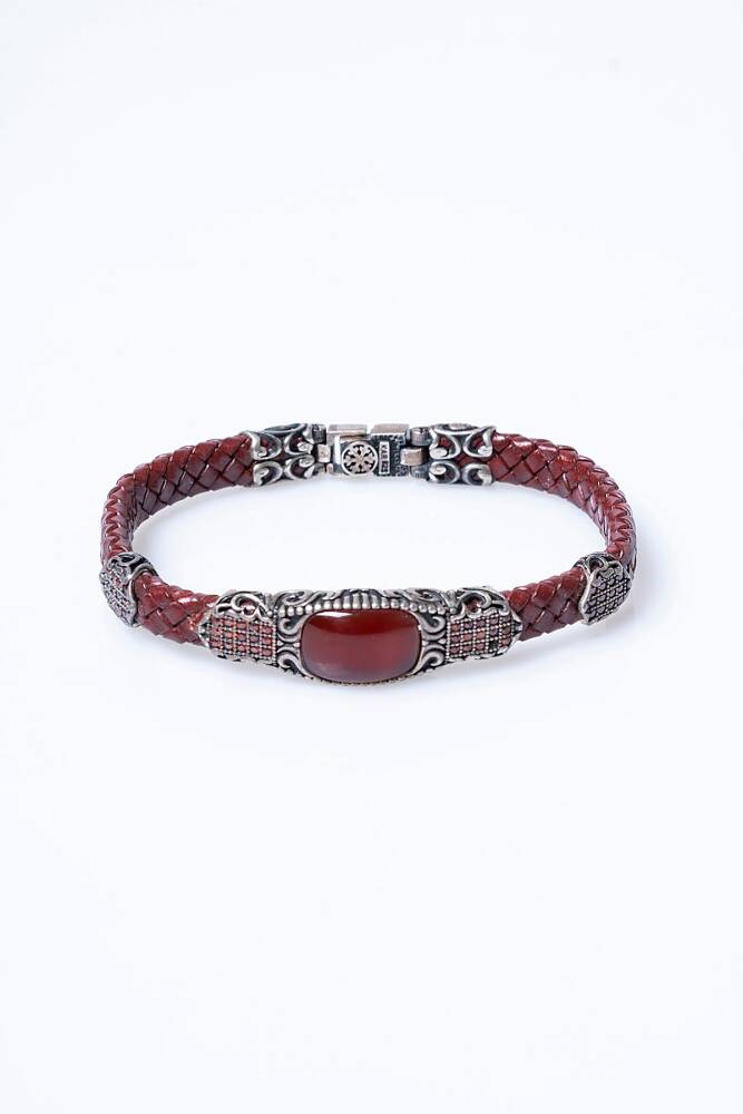 El İşçiliği Gümüş Akik Doğal Taş Detaylı Deri Bileklik