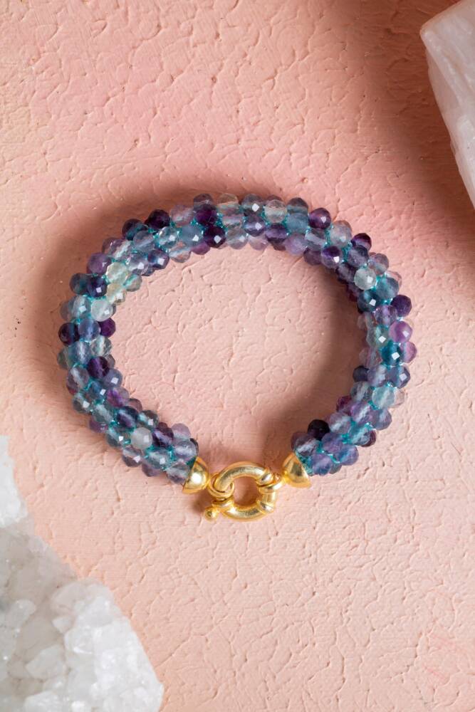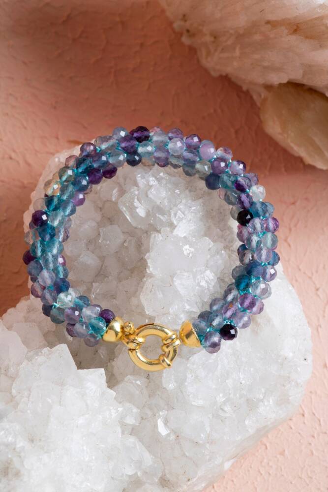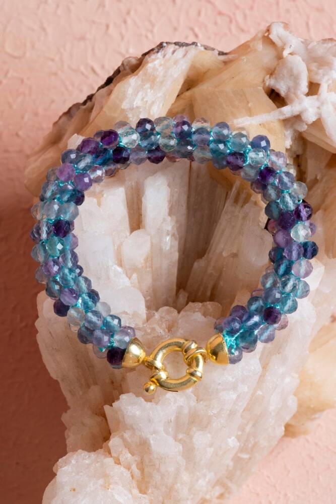 Ustalıkla Örülmüş Tasarım: Her bir Florit tanesinin (yeşil, mor, mavi tonlarda) özenle birleştirildiği El İşçiliği Örme tekniği, bilekliğin enerjisini güçlendirir ve cilde yumuşak, konforlu bir temas sağlar.