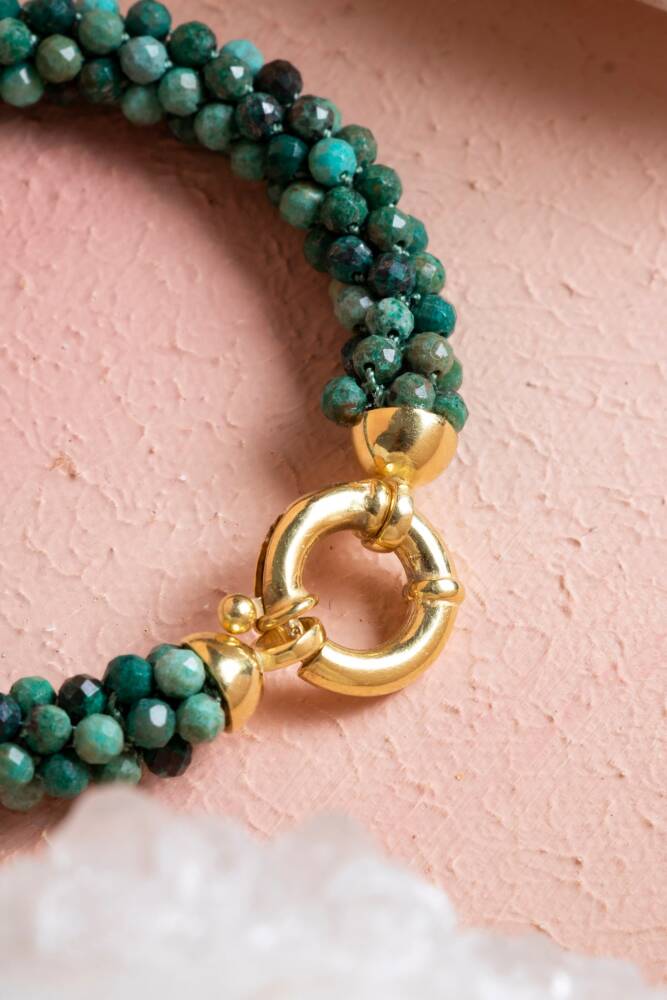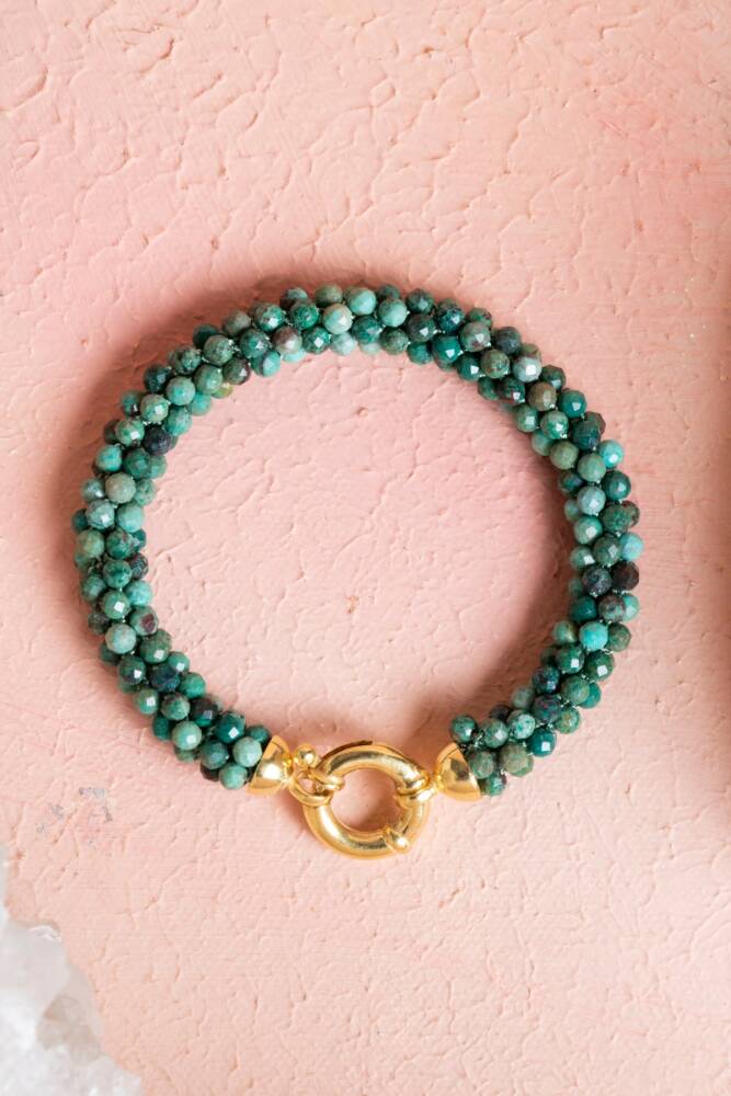 Huzuru, dinginliği ve duygusal şifayı bileğinizde hissedin! Krizokol doğal taşının eşsiz mavi-yeşil tonları ve sakinleştirici enerjisi, usta El İşçiliği Örme tekniğiyle hazırlanmış bu özel bileklikte birleşiyor. Şık ve güvenli Gümüş Kapama detayıyla tamamlanan bu bileklik, size sürekli netlik, içsel sükûnet ve duygusal denge sağlayan güçlü bir enerji kaynağıdır.