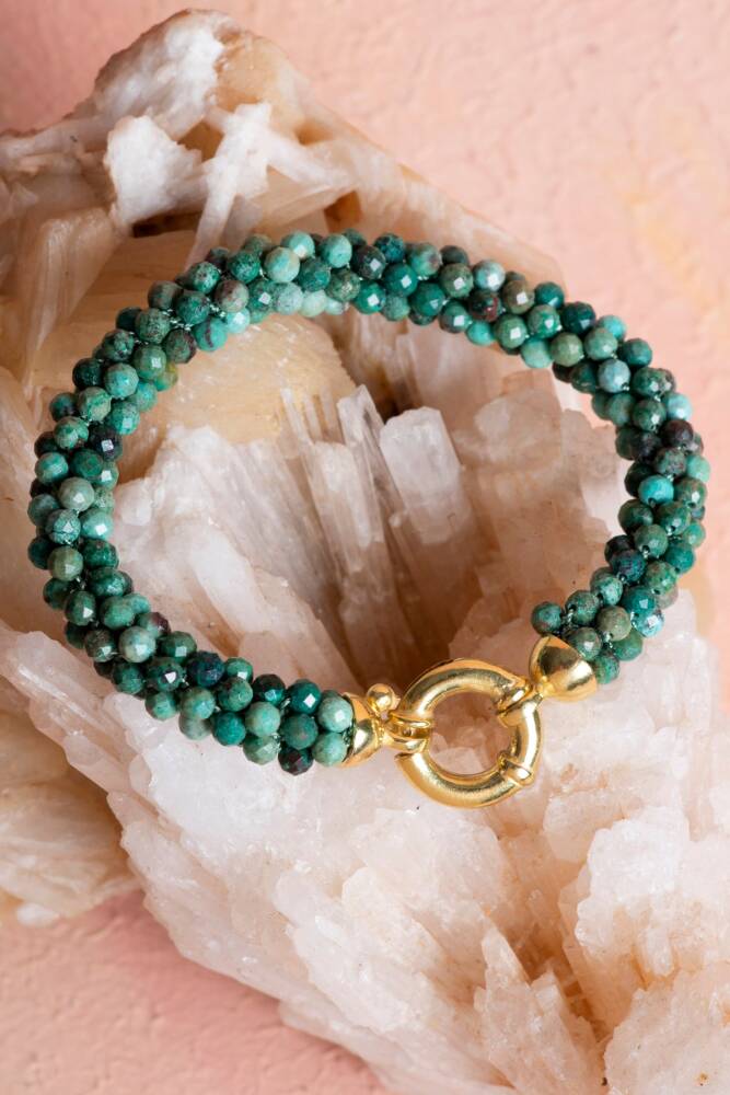 Ustalıkla Örülmüş Tasarım: Her bir Krizokol tanesinin özenle birleştirildiği El İşçiliği Örme tekniği, bilekliğin enerjisini güçlendirir ve cilde yumuşak, konforlu bir temas sağlar.