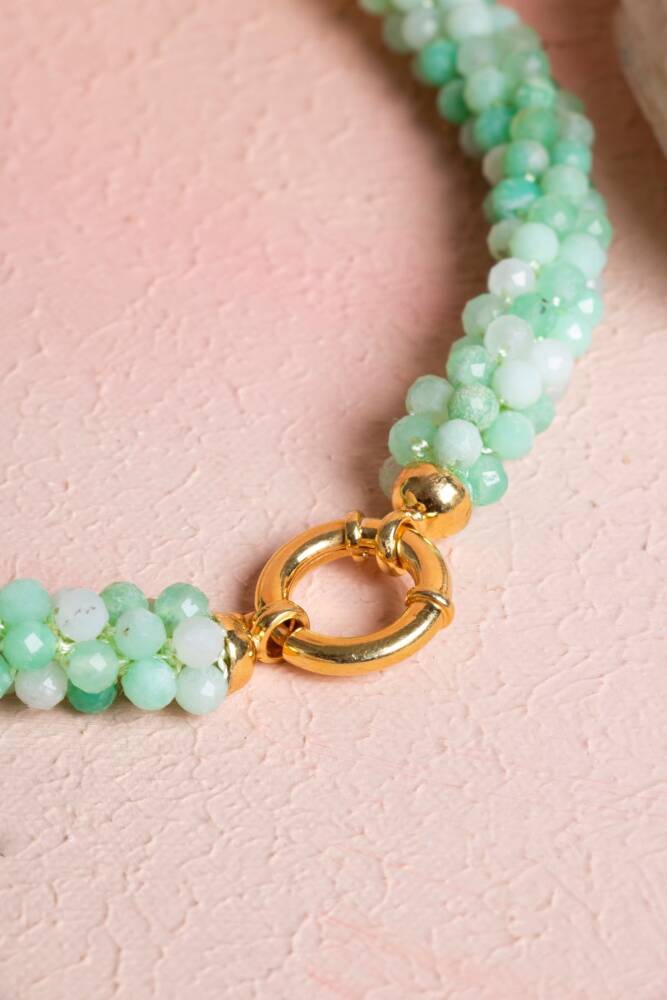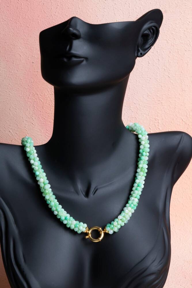 Ustalıkla Örülmüş Tasarım: Her bir Krizopras tanesinin özenle birleştirildiği El İşçiliği Örme tekniği, kolyenin enerjisini güçlendirir ve cilde yumuşak, konforlu bir temas sağlar.