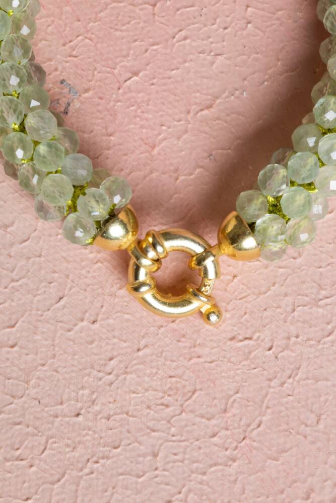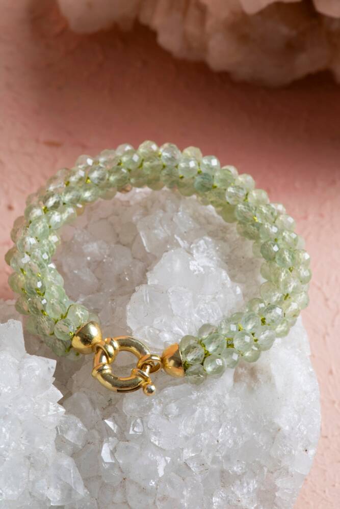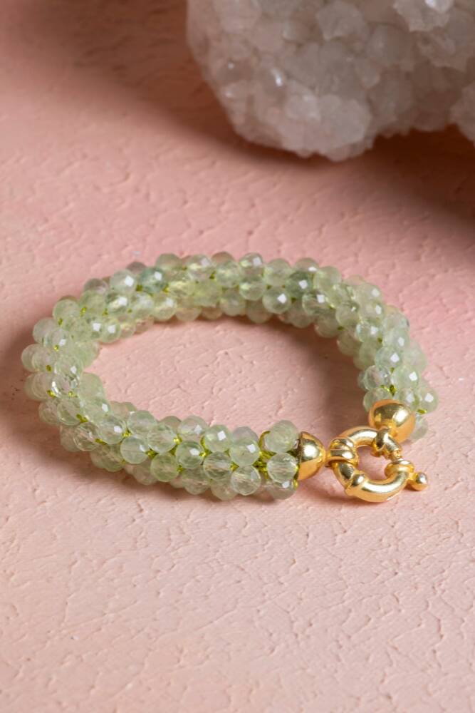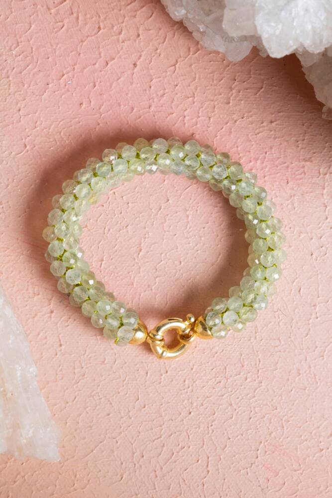 Ustalıkla Örülmüş Tasarım: Her bir Prehnit tanesinin özenle birleştirildiği El İşçiliği Örme tekniği, bilekliğin enerjisini güçlendirir ve cilde yumuşak, konforlu bir temas sağlar.
