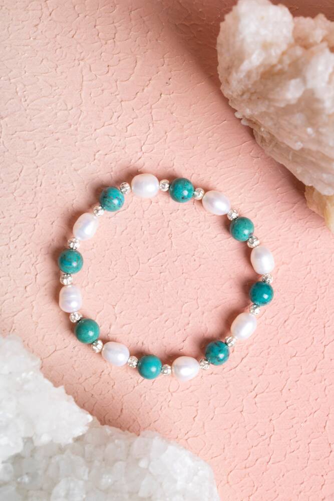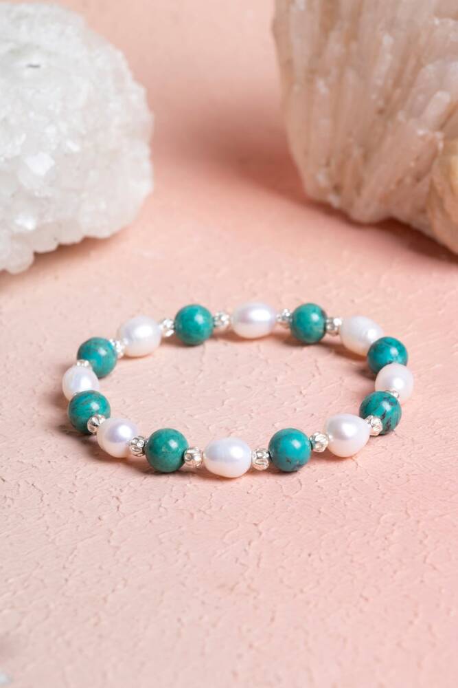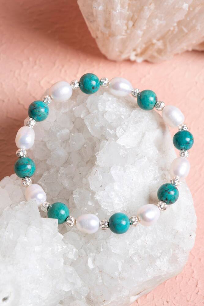Firuze'nin (Turkuaz) canlı mavi-yeşil tonları ile İnci'nin sedefli, narin ışıltısı, bileğinize asil ve zarif bir dokunuş katar. Bu bileklik, enerjinizi sürekli olarak pozitif ve dengede tutar.