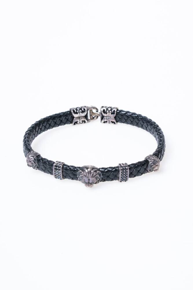 Gümüş Aslan Detaylı Deri Bileklik