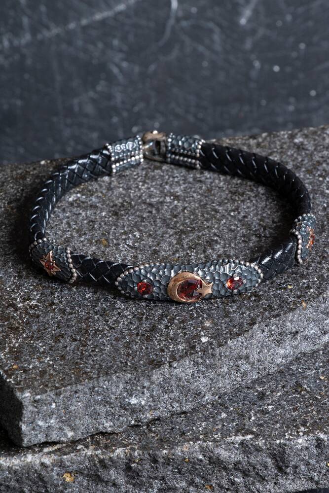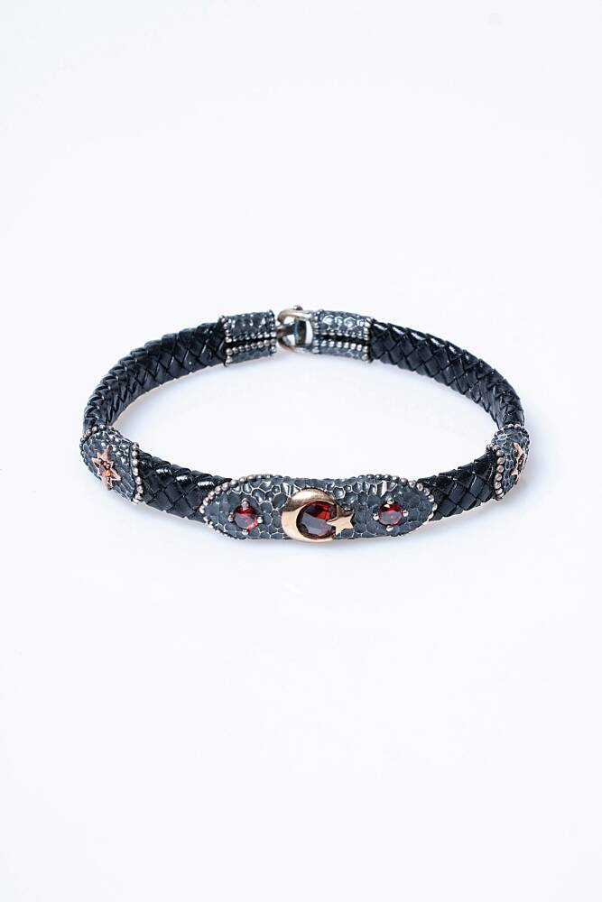Gümüş Ay Yıldız Detaylı Deri Bileklik