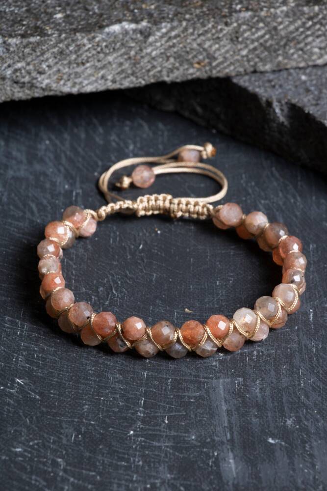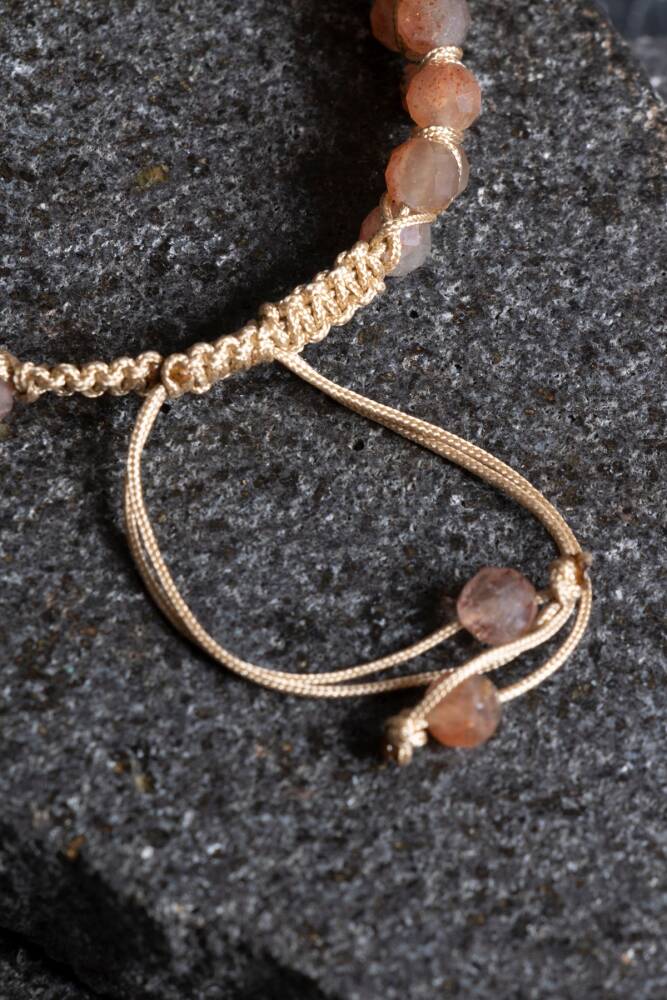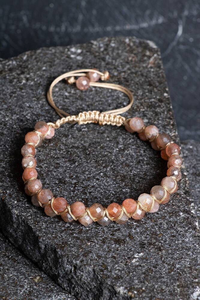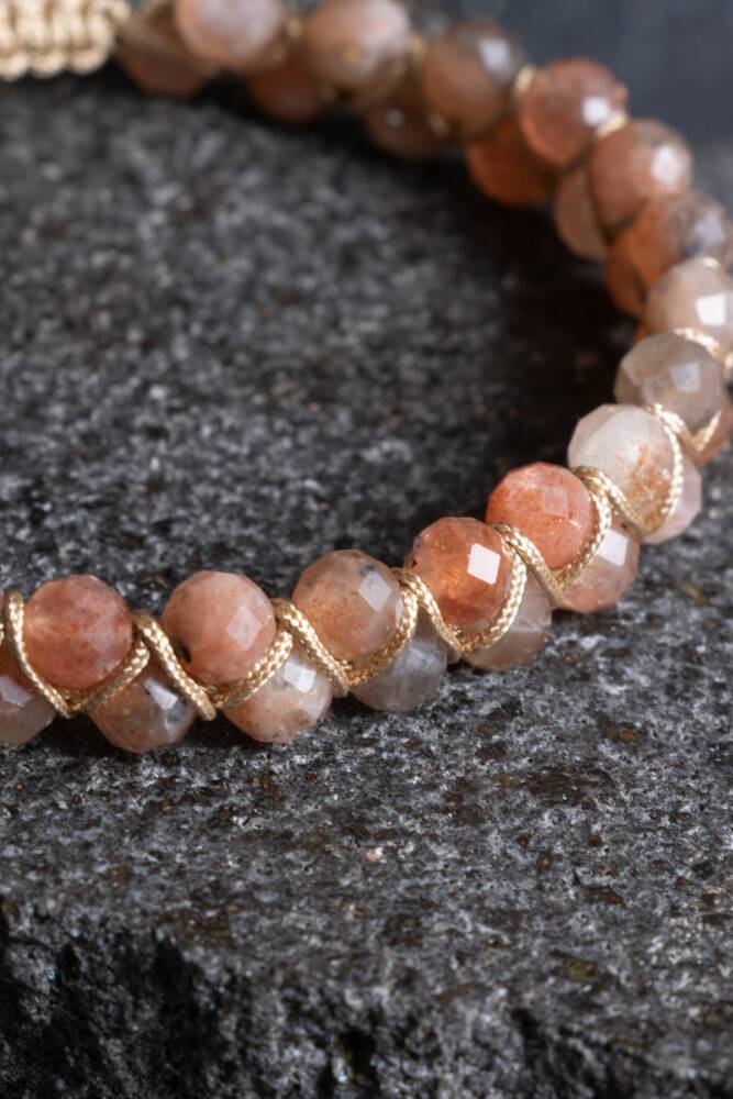 Doğanın en neşeli ve canlandırıcı taşlarından biri olan Güneş Taşı (Sunstone), 6 mm'lik taşların çift sıra dizimi ve titiz makrome örgüyle bu özel tasarımda buluştu. İçindeki pırıltılı yansımalarıyla dikkat çeken bu taş, el emeği düğümlerle birleşerek hem bohem hem de modern bir stil sunuyor.