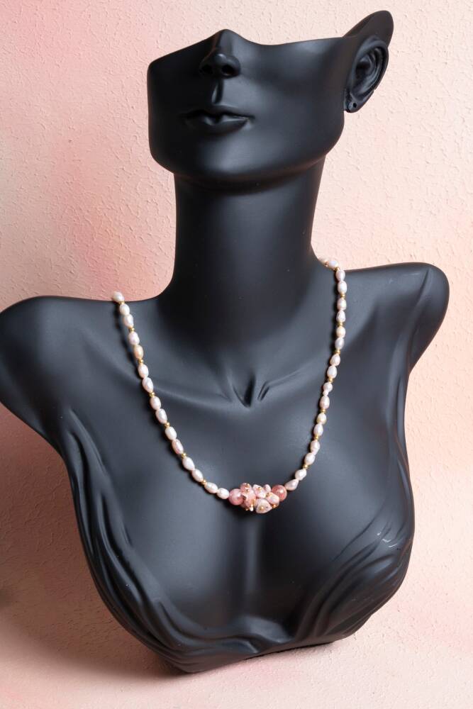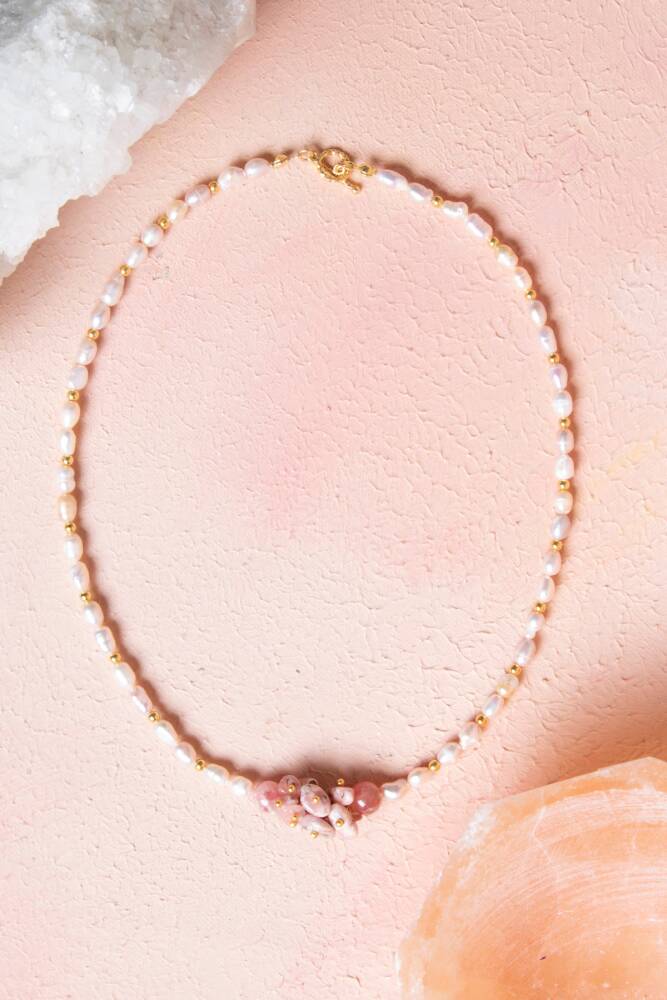 'Yaşama Sevinci Taşı' olarak bilinen ve içindeki mikroskobik pırıltılarla adeta parıldayan Güneş Taşı, yüzyıllardır saflığın simgesi olan İnci ile bu eşsiz tasarımda bir araya geldi. Bu kolye, bir yandan enerjinizi yükseltirken diğer yandan klasik bir zarafeti stilinize dahil eden modern bir mücevherdir.
