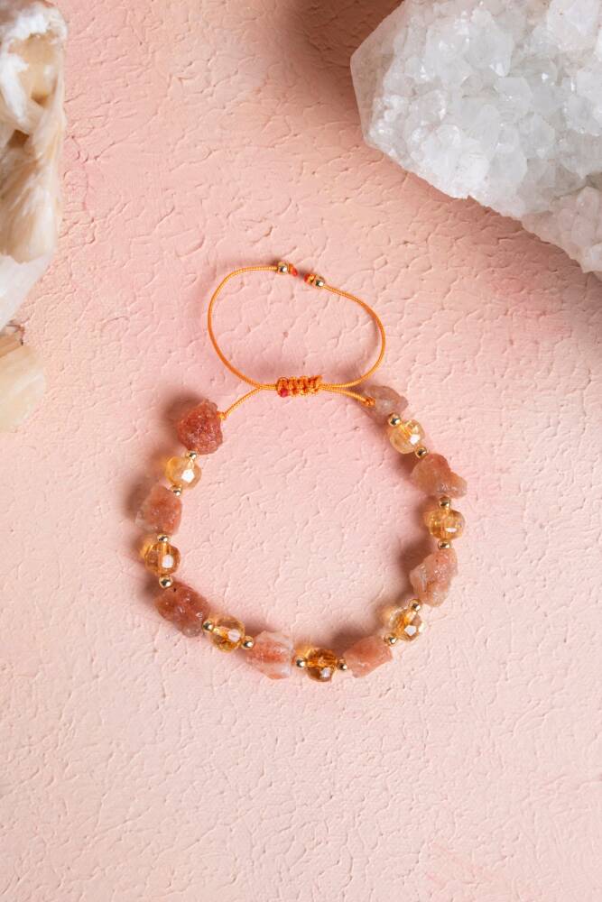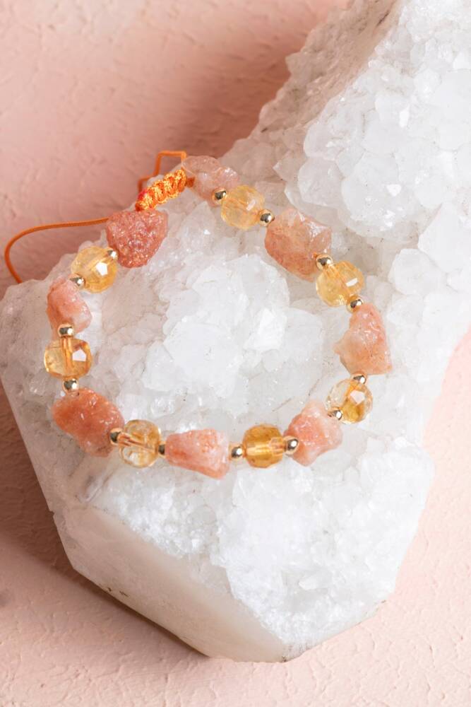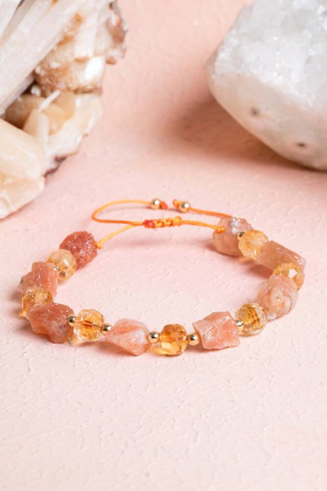 Canlı Tonlar: Güneş Taşı'nın sıcak turuncu-kahverengi ışıltısı ile Sitrin'in güneşli sarı tonları, bileğinize dinamik ve neşeli bir enerji akışı sağlar.
