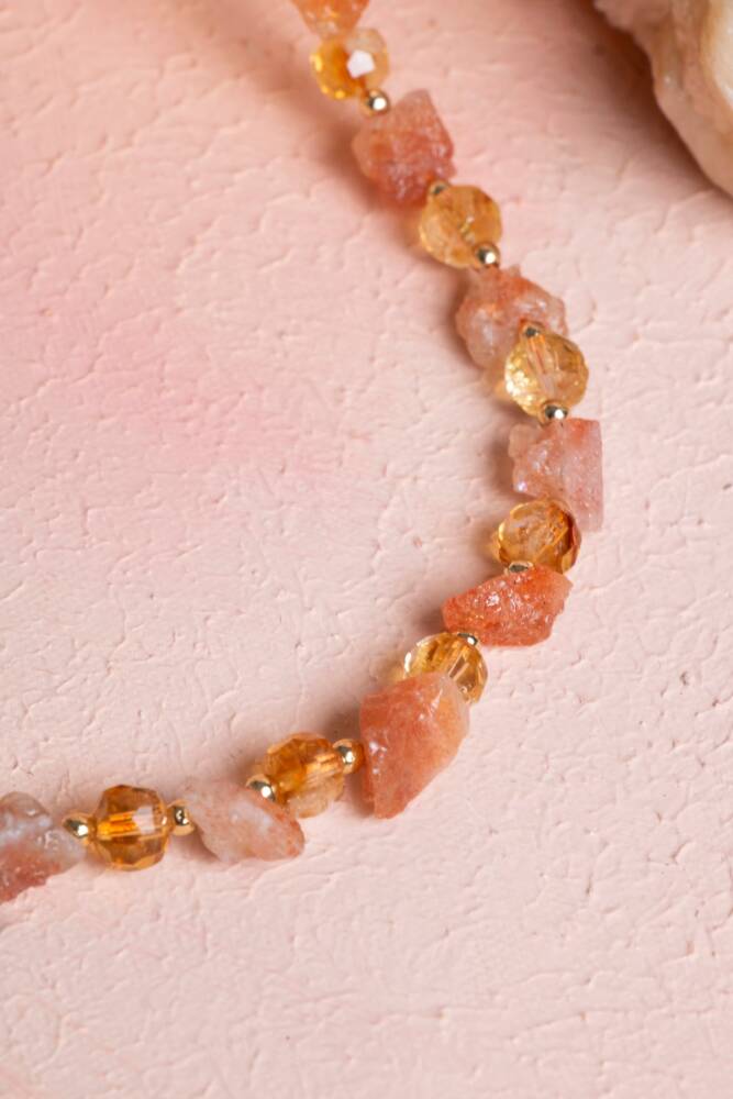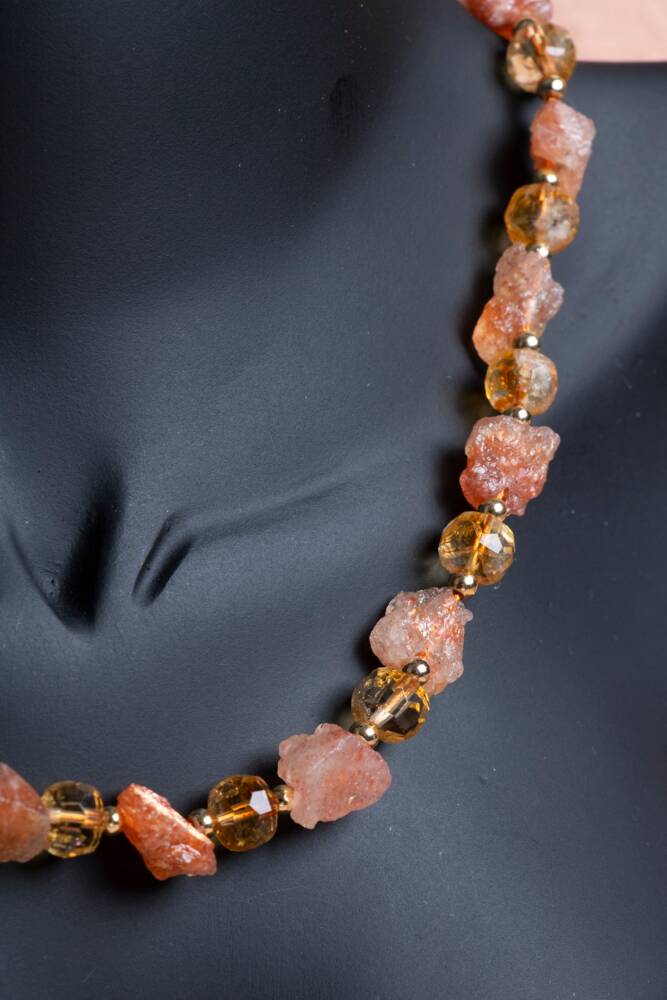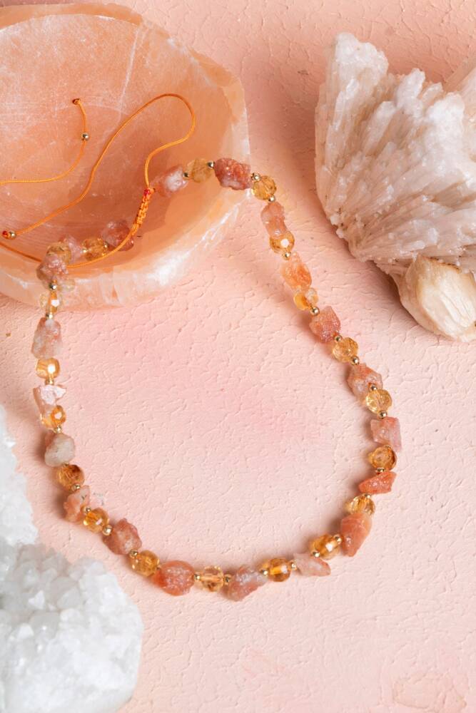 Canlı Tonlar: Güneş Taşı'nın sıcak, ışıltılı tonları ile Sitrin'in güneşli sarı tonları, kolyenin enerjisini boynunuzda ve göğüs bölgenizde canlı tutar.