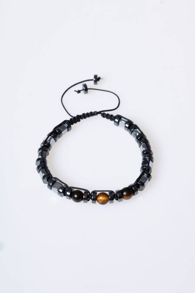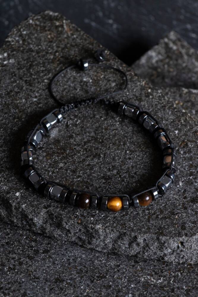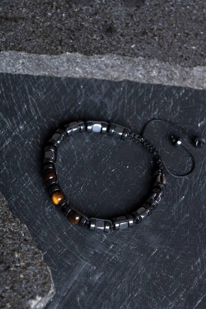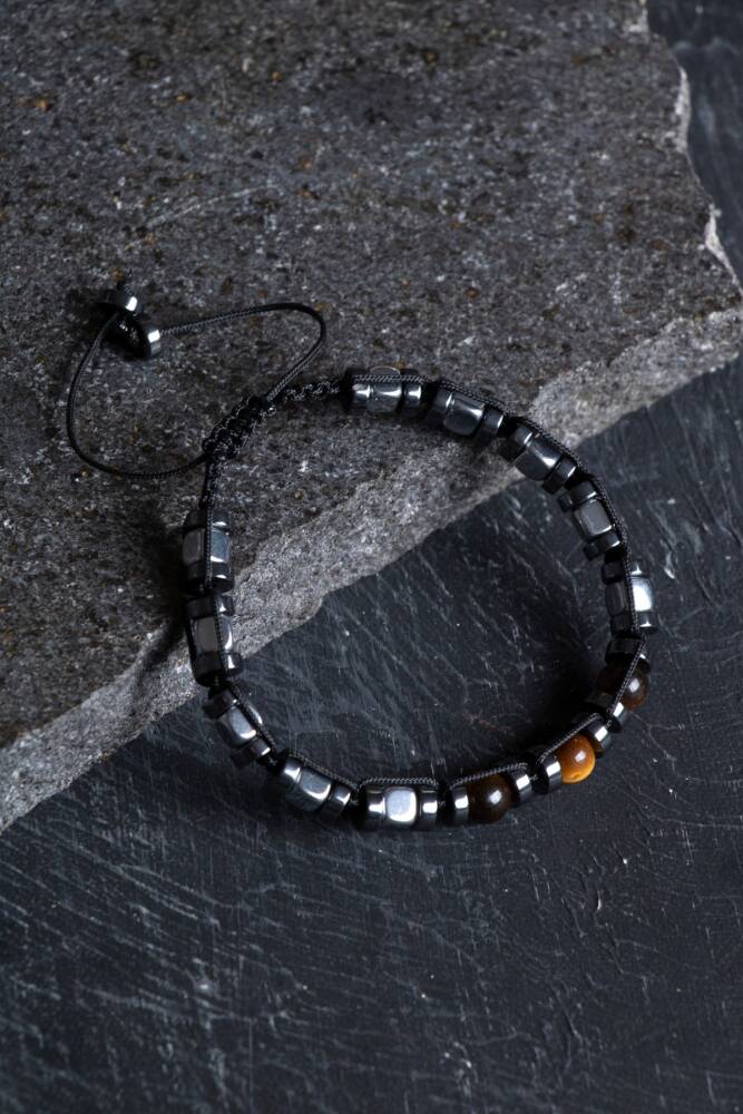 Doğanın en maskülen taşlarından olan metalik Hematit ve büyüleyici dokusuyla Kaplan Gözü, dayanıklı makrome örgüsüyle bu özel tasarımda bir araya geldi. Geleneksel el işçiliğini doğal taşların kadim enerjisiyle birleştiren bu bileklik, günlük şıklığınıza karizmatik bir dokunuş katar.