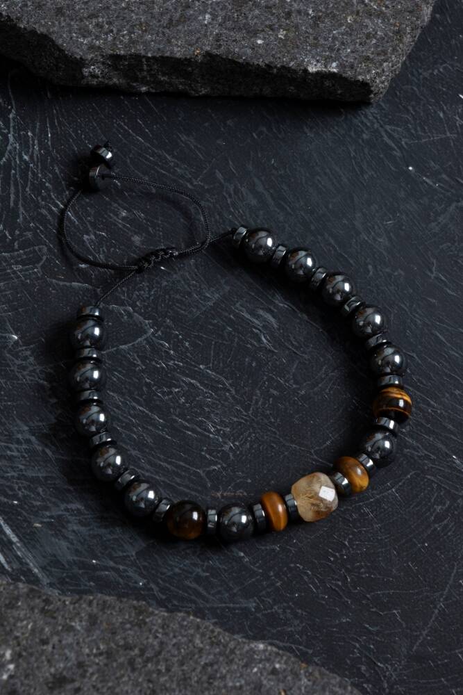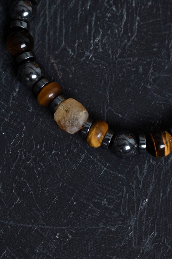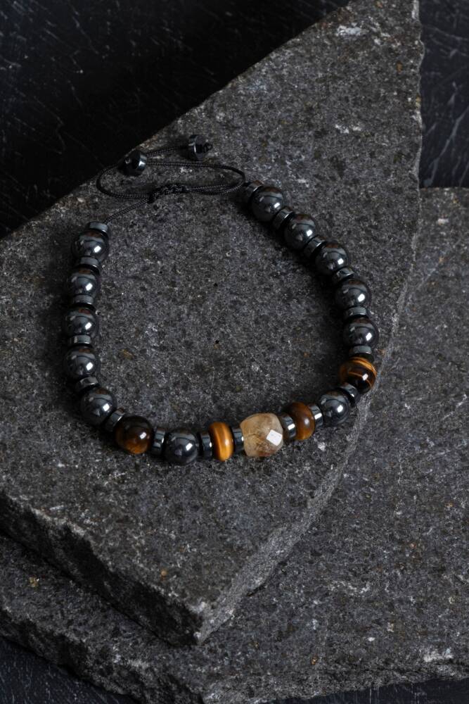 Doğal hematit, kaplan gözü ve sitrin taşlarıyla hazırlanan bu bileklik; zihinsel netlik, cesaret ve bolluk enerjisi sunar.