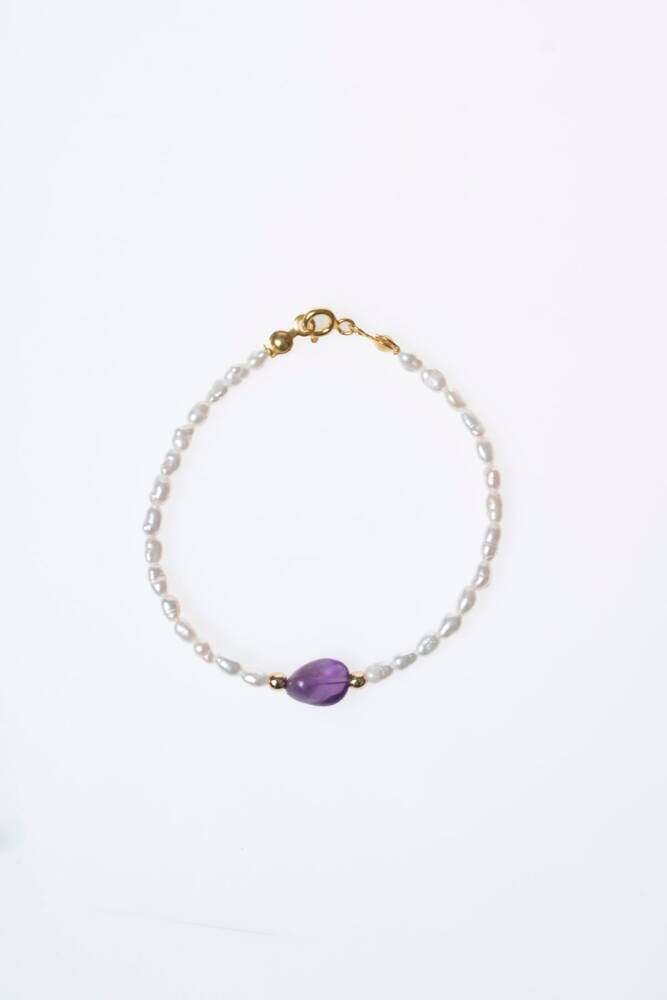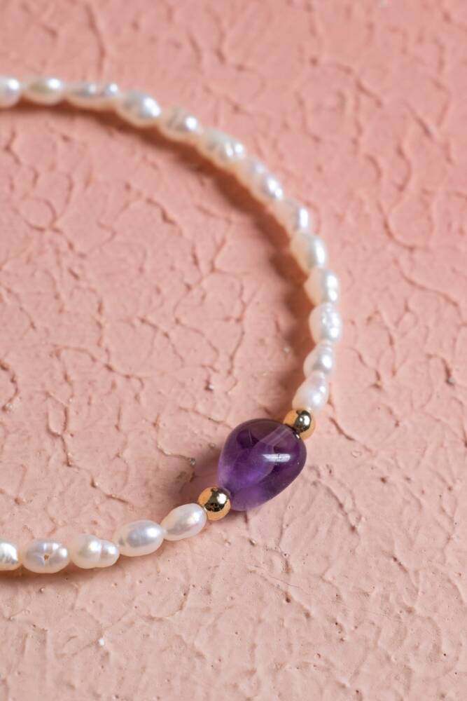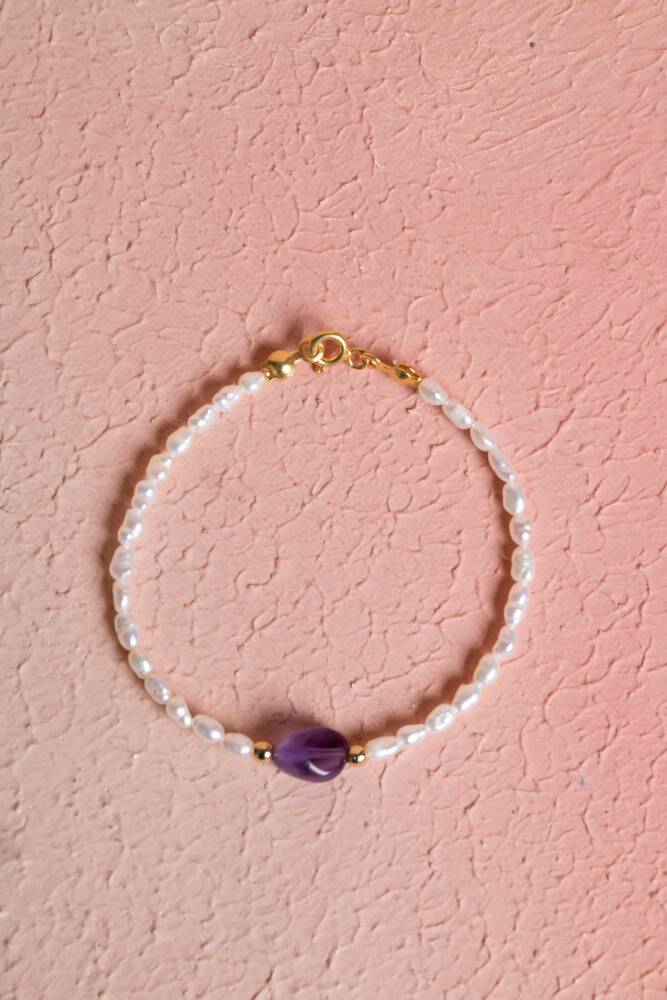 Zarafeti, huzuru ve ruhsal korumayı bileğinizde birleştirin. İnci'nin saflığı ve Ametist'in sakin mor enerjisi, şık ve güvenli bir Gümüş Kapama detayıyla tamamlanarak bu özel bileklikte buluşuyor. Bu bileklik, size duygusal denge, zihinsel dinginlik ve güçlü bir destek sağlayan değerli bir objedir.