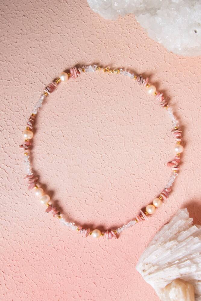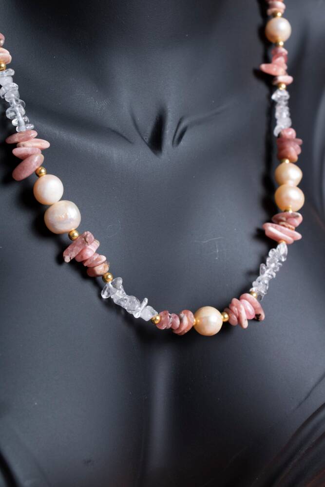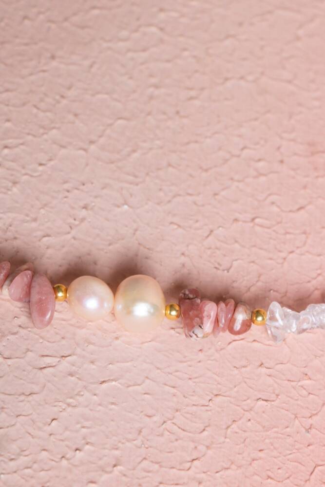 Kolyedeki taşların doğal renk ve dokuları, organik ve sofistike bir estetik yaratır. Rodokrozit'in pembe ve beyaz çizgileri, Kuvars'ın berrak ışıltısı ve İnci'nin sedefli parlaklığı, günlük kullanımınızda size eşlik ederken enerjinizi sürekli destekler.