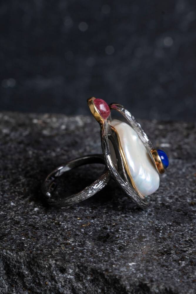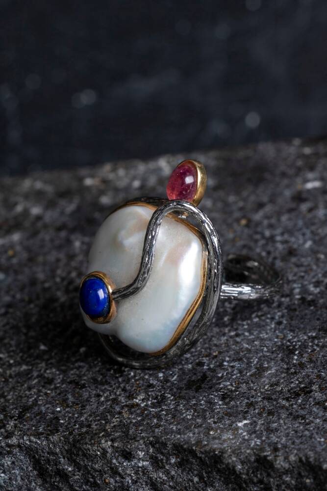 Bu yüzük, orijinalliği ve kalitesi onaylanmış Sertifikalı İnci, Turmalin ve Lapis Lazuli taşları kullanılarak üretilmiştir.